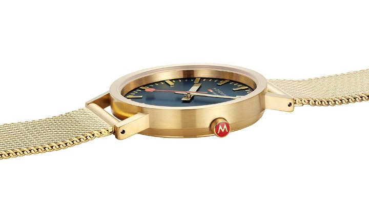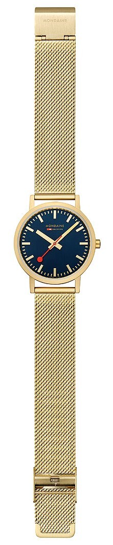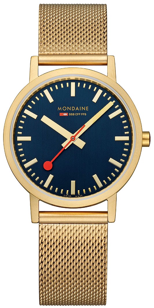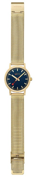 MONDAINE Classic A660.30314.40SBM jsou dámské elegantní hodinky na ocelovém milánském tahu s povrchovou PVD úpravou zlaté barvy a posuvnou sponou. Pouzdro z nerezové oceli ve stejné barvě má průměr 36 milimetrů. Přehledný modrý číselník je chráněn minerálním sklíčkem a je inspirován ikonickými nádražními hodinami s červenou sekundovou ručkou. Pohon hodinek zajišťuje quartzový strojek Ronda 513. S vodotěsností 3 ATM jsou hodinky odolné proti dešti a při mytí rukou.
