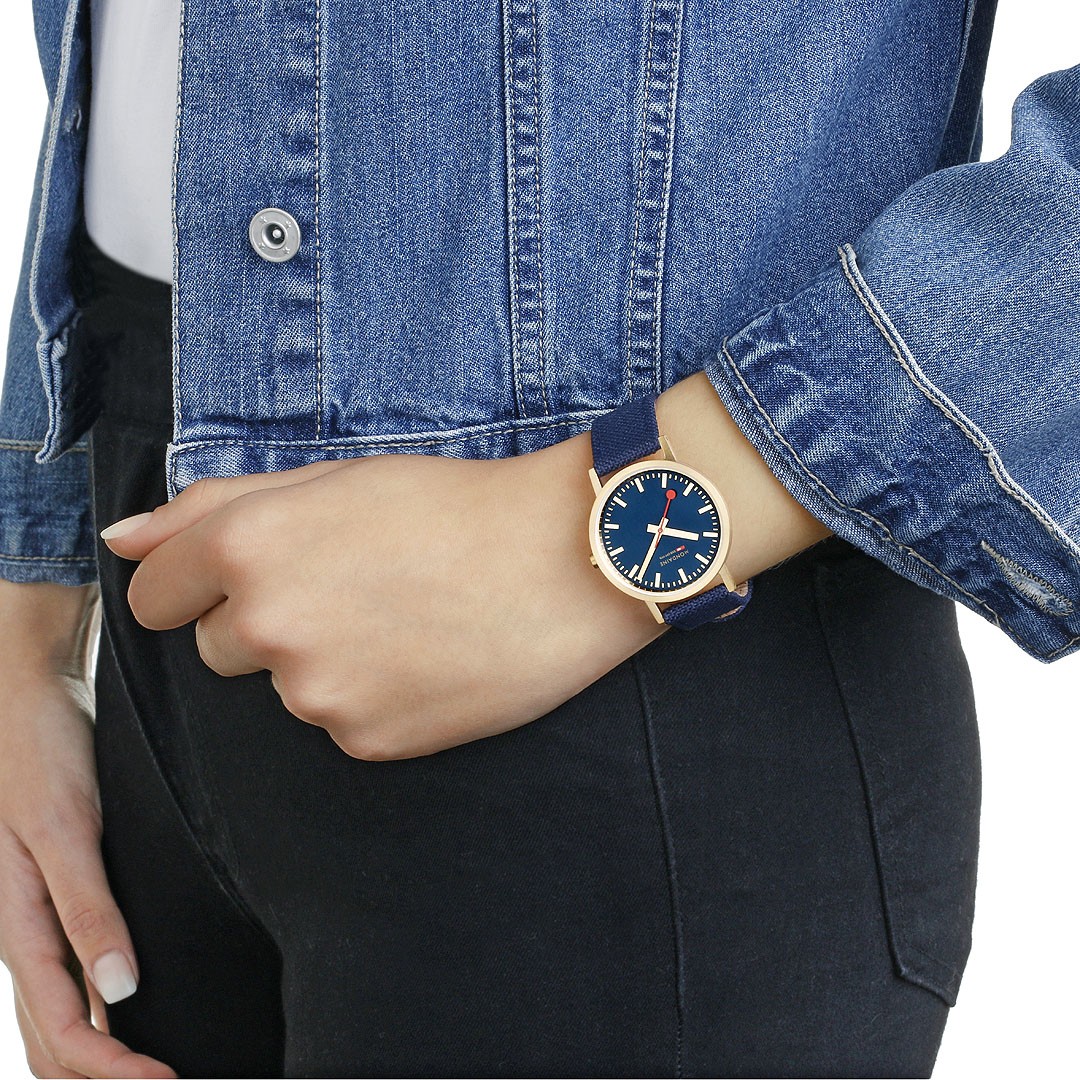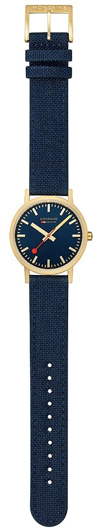 MONDAINE Classic A660.30314.40SBQ jsou dámské hodinky na tmavě modrém textilním řemínku z recyklovaných PET lahví s korkovou podšívkou a trnovou sponou. Pouzdro z nerezové oceli s PVD úpravou ve zlaté barvě má průměr 36 milimetrů. Přehledný modrý číselník je chráněn minerálním sklíčkem a je inspirován ikonickými nádražními hodinami s červenou sekundovou ručkou. Pohon hodinek zajišťuje quartzový strojek Ronda 513. S vodotěsností 3 ATM jsou hodinky odolné proti dešti a při mytí rukou.