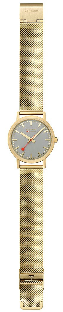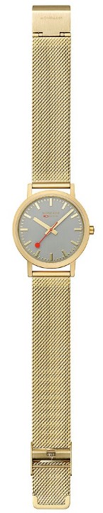 MONDAINE Classic A660.30314.80SBM jsou dámské elegantní hodinky na ocelovém milánském tahu s povrchovou PVD úpravou zlaté barvy a posuvnou sponou. Pouzdro z nerezové oceli ve stejné barvě má průměr 36 milimetrů. Přehledný šedý číselník je chráněn minerálním sklíčkem a je inspirován ikonickými nádražními hodinami s červenou sekundovou ručkou. Pohon hodinek zajišťuje quartzový strojek Ronda 513. S vodotěsností 3 ATM jsou hodinky odolné proti dešti a při mytí rukou.