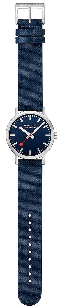 MONDAINE Classic A660.30360.40SBD jsou pánské hodinky na tmavě modrém textilním řemínku z recyklovaných PET lahví s korkovou podšívkou a trnovou sponou. Pouzdro z nerezové oceli má průměr 40 milimetrů. Přehledný modrý číselník je chráněn minerálním sklíčkem a je inspirován ikonickými nádražními hodinami s červenou sekundovou ručkou. Pohon hodinek zajišťuje quartzový strojek Ronda 513. S vodotěsností 3 ATM jsou hodinky odolné proti dešti a při mytí rukou.