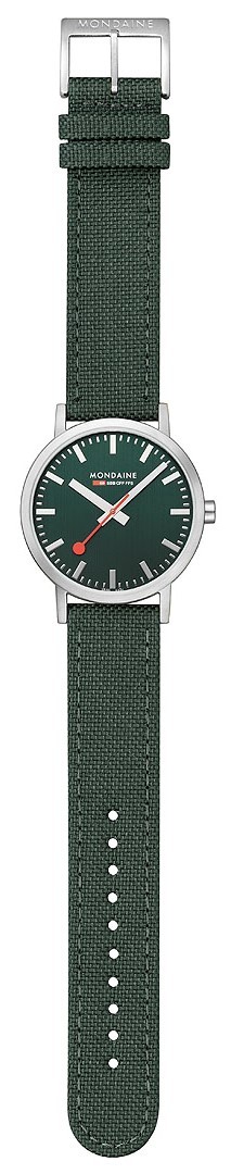 MONDAINE Classic A660.30360.60SBF jsou pánské hodinky na zeleném textilním řemínku z recyklovaných PET lahví s korkovou podšívkou a trnovou sponou. Pouzdro z nerezové oceli má průměr 40 milimetrů. Přehledný zelený číselník je chráněn minerálním sklíčkem a je inspirován ikonickými nádražními hodinami s červenou sekundovou ručkou. Pohon hodinek zajišťuje quartzový strojek Ronda 513. S vodotěsností 3 ATM jsou hodinky odolné proti dešti a při mytí rukou.