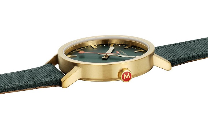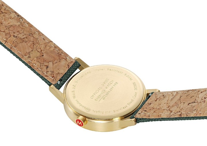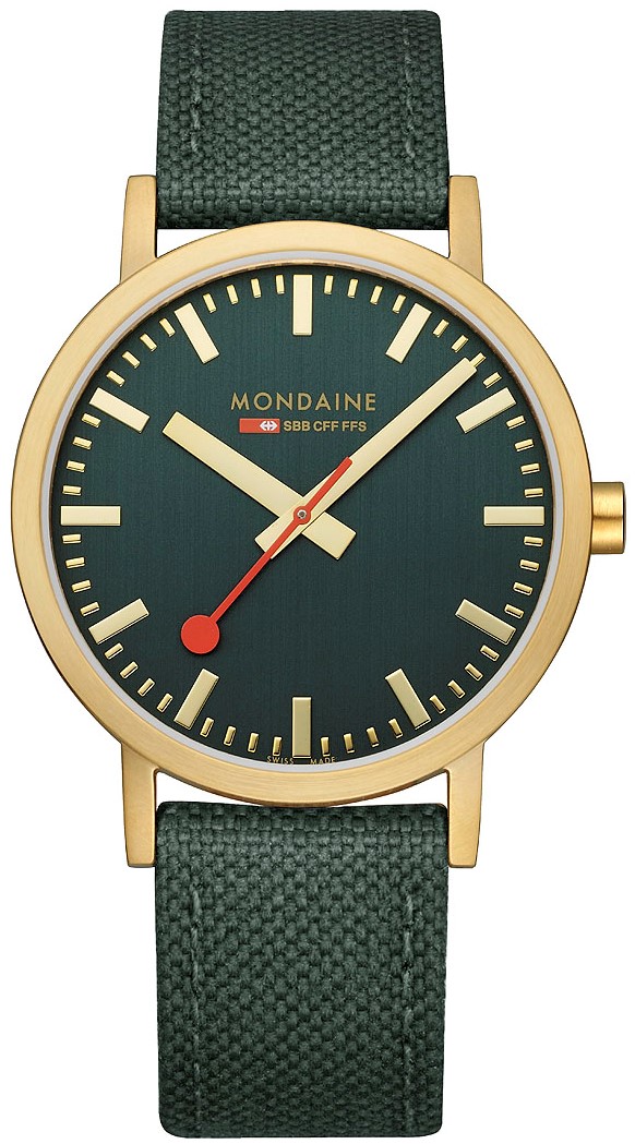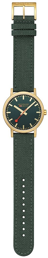 MONDAINE Classic A660.30360.60SBS jsou pánské hodinky na zeleném textilním řemínku z recyklovaných PET lahví s korkovou podšívkou a trnovou sponou. Pouzdro z nerezové oceli s povrchovou PVD úpravou zlaté barvy má průměr 40 milimetrů. Přehledný zelený číselník je chráněn minerálním sklíčkem a je inspirován ikonickými nádražními hodinami s červenou sekundovou ručkou. Pohon hodinek zajišťuje quartzový strojek Ronda 513. S vodotěsností 3 ATM jsou hodinky odolné proti dešti a při mytí rukou.