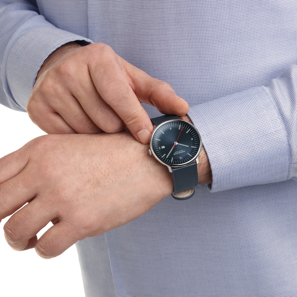 MONDAINE Doppio MLE.41240.LQV.SET sú pánske elegantné hodinky na modrom remienku z vegánskej kože s tŕňovou sponou. Puzdro z nerezovej ocele má priemer 41 milimetrov. Konkávny tmavomodrý číselník s efektom slnečného brusu a ukazovateľom dátumu na tretej hodine je chránený odolným dvojito zakriveným zafírovým sklíčkom s antireflexnou vrstvou a je inšpirovaný ikonickými staničnými hodinami s červenou sekundovou ručičkou. Pohon hodiniek zaisťuje quartzový strojček Ronda 515. S vodotesnosťou 5 ATM sú hodinky odolné proti dažďu a pri sprchovaní. Súčasťou balenia je náhradný remienok - oceľový milánsky ťah, vzhľad hodiniek sa tak dá ľahko meniť.