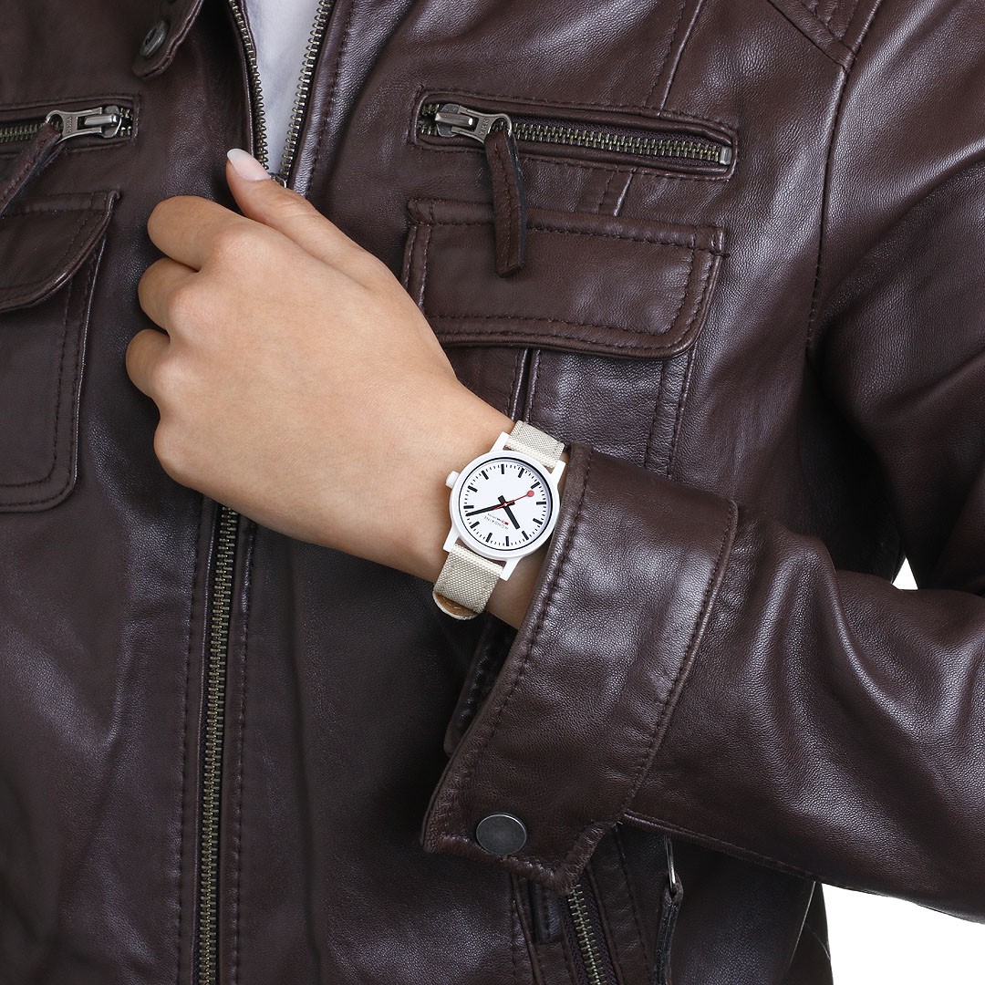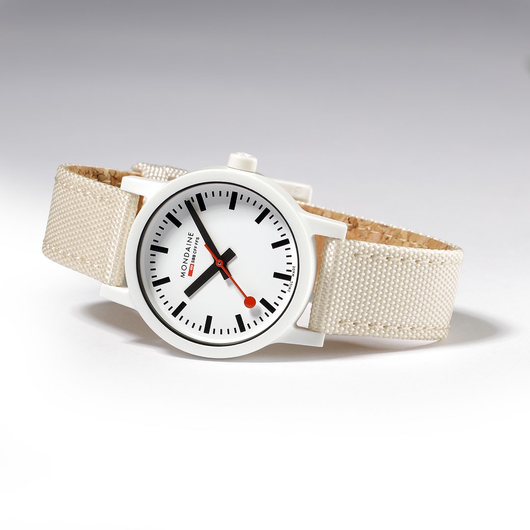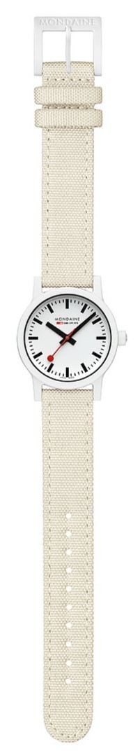 MONDAINE Essence MS1.32111.LT jsou dámské hodinky na béžovo-bílém textilním řemínku z recyklovaných PET lahví s korkovou podšívkou a trnovou sponou. Pouzdro o průměru 32 milimetrů je vyrobeno z polyamidu na bázi ricinového oleje. Přehledný bílý číselník je chráněn minerálním sklíčkem a je inspirován ikonickými nádražními hodinami s červenou sekundovou ručkou. Pohon hodinek zajišťuje quartzový strojek Ronda 513. S vodotěsností 3 ATM jsou hodinky odolné proti dešti a při mytí rukou.