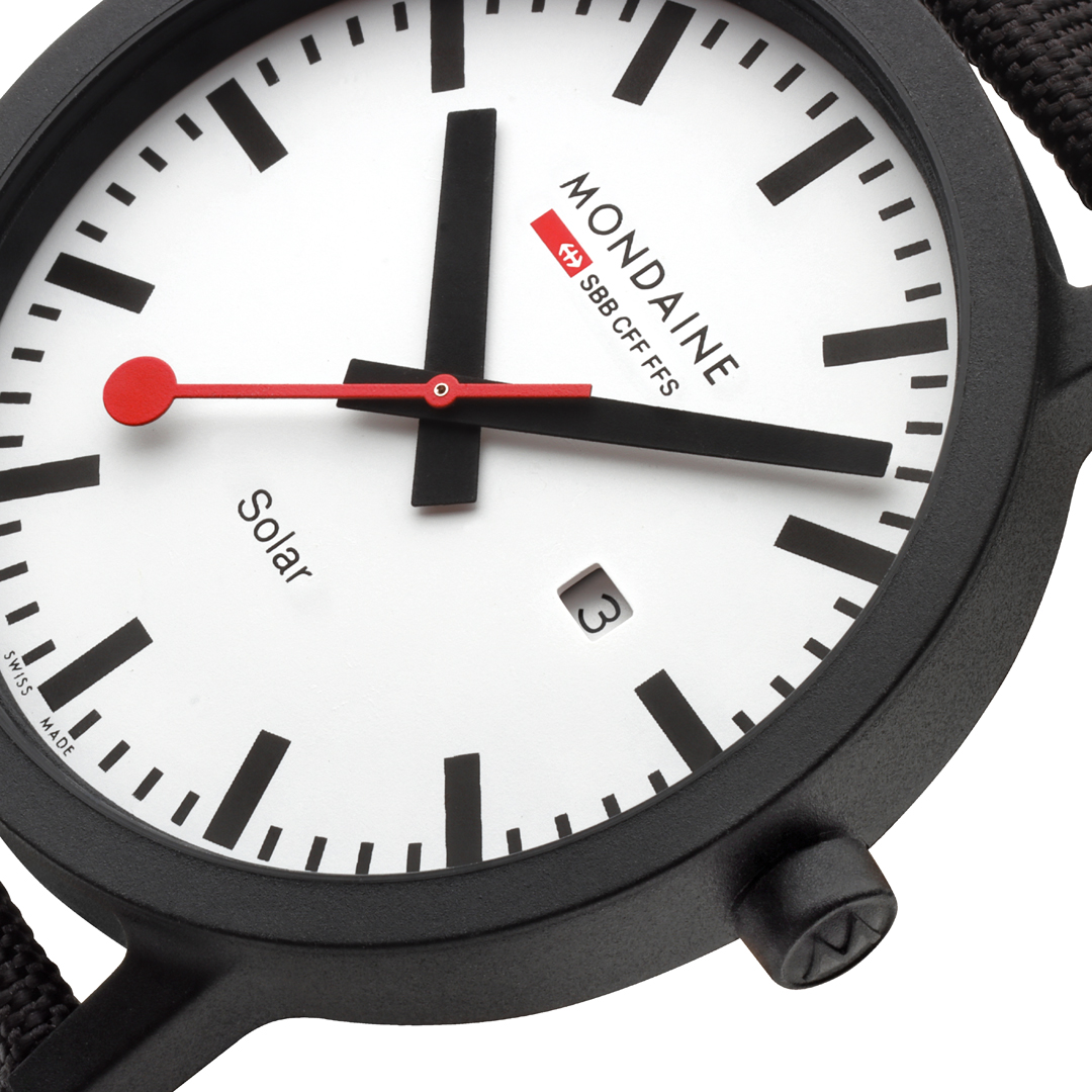 MONDAINE Essence Solar MS1.41910.LB sú pánske solárne hodinky na čiernom textilnom remienku z recyklovaných PET fliaš s korkovou podšívkou a tŕňovou sponou. Puzdro s priemerom 41 milimetrov je vyrobené z polyamidu na báze ricínového oleja. Prehľadný biely číselník s ukazovateľom dátumu na tretej hodine je chránený minerálnym sklíčkom a je inšpirovaný ikonickými staničnými hodinami s červenou sekundovou ručičkou. Pohon hodiniek zaisťuje strojček Ronda 215 so solárnym napájaním. S vodotesnosťou 3 ATM sú hodinky odolné proti dažďu a pri umývaní rúk.