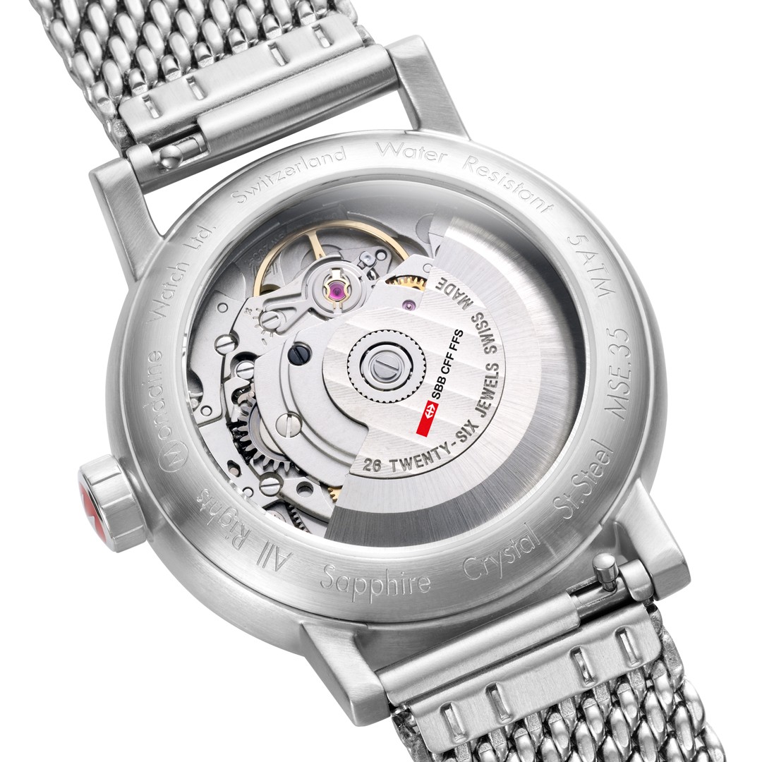 MONDAINE Evo2 Automatic MSE.35610.SM jsou dámské elegantní automatické hodinky na ocelovém milánském tahu s posuvnou sponou. Pouzdro z nerezové oceli má průměr 35 milimetrů a průhledné dýnko. Bílý číselník s ukazatelem data na třetí hodině je chráněn safírovým sklíčkem a je inspirován ikonickými nádražními hodinami s červenou sekundovou ručkou. Pohon hodinek zajišťuje mechanický strojek SW220-1 s automatickým nátahem a rezervou chodu 38 hodin. S vodotěsností 5 ATM jsou hodinky odolné proti dešti a při sprchování.