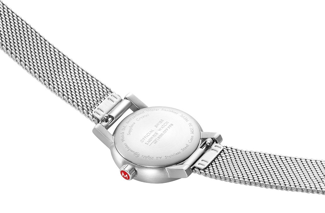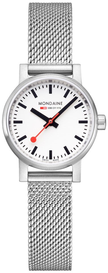MONDAINE Evo2 MSE.26110.SM jsou dámské elegantní bateriové hodinky na ocelovém milánském tahu s posuvnou sponou. Pouzdro z nerezové oceli má průměr 26 milimetrů. Přehledný bílý číselník je chráněn safírovým sklíčkem a je inspirován ikonickými nádražními hodinami s červenou sekundovou ručkou. Pohon hodinek zajišťuje quartzový strojek Ronda 513. S vodotěsností 3 ATM jsou hodinky odolné proti dešti a při mytí rukou.