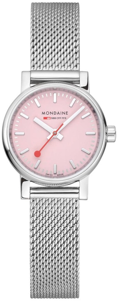 MONDAINE Evo2 MSE.26130.SM jsou dámské elegantní bateriové hodinky na ocelovém milánském tahu s posuvnou sponou. Pouzdro z nerezové oceli má průměr 26 milimetrů. Přehledný růžový číselník je chráněn safírovým sklíčkem a je inspirován ikonickými nádražními hodinami s červenou sekundovou ručkou. Pohon hodinek zajišťuje quartzový strojek Ronda 513. S vodotěsností 3 ATM jsou hodinky odolné proti dešti a při mytí rukou.
