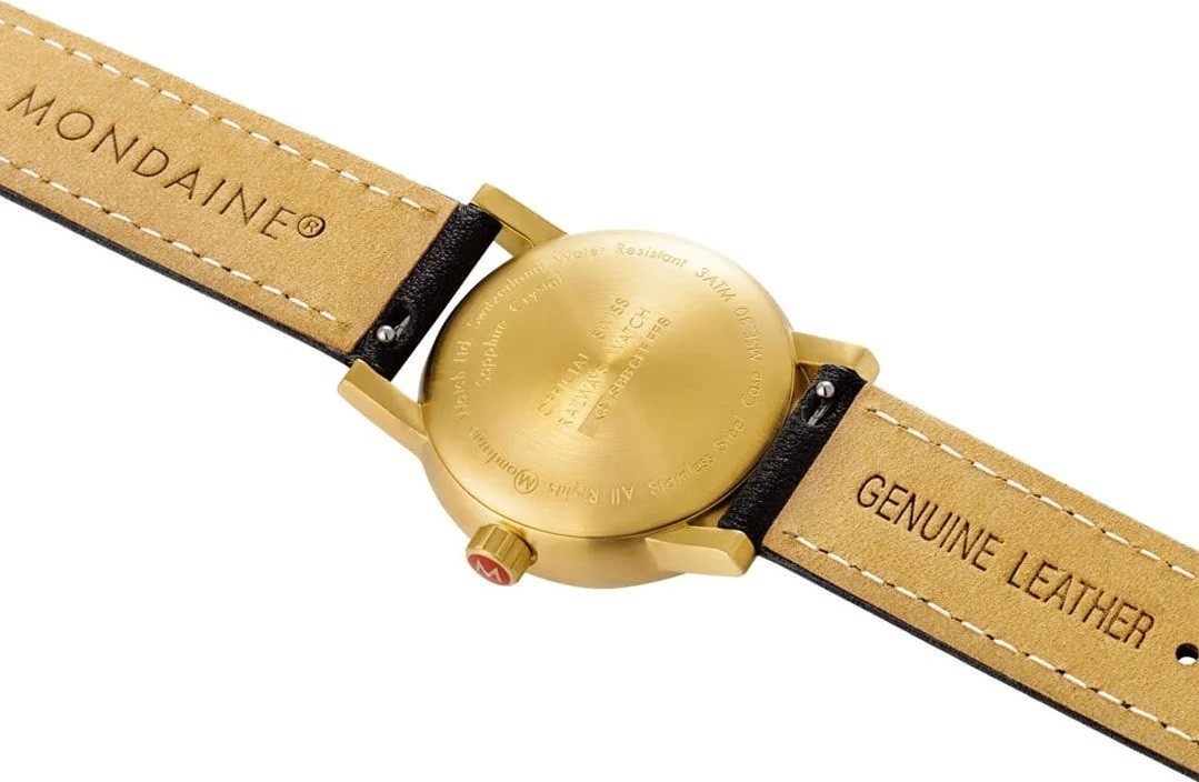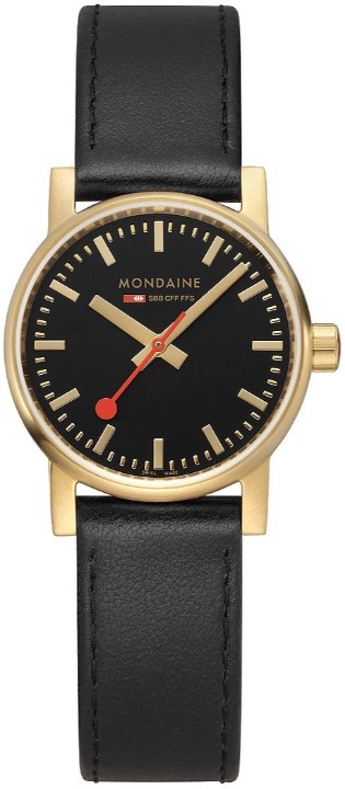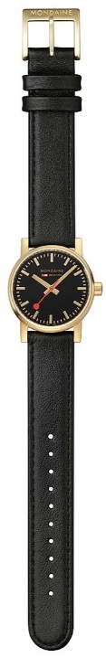 MONDAINE Evo2 MSE.30120.LB jsou dámské elegantní bateriové hodinky na černém řemínku z veganské kůže s trnovou sponou. Pouzdro z nerezové oceli s povrchovou PVD úpravou ve zlaté barvě má průměr 30 milimetrů. Přehledný černý číselník je chráněn safírovým sklíčkem a je inspirován ikonickými nádražními hodinami s červenou sekundovou ručkou. Pohon hodinek zajišťuje quartzový strojek Ronda 503. S vodotěsností 3 ATM jsou hodinky odolné proti dešti a při mytí rukou.