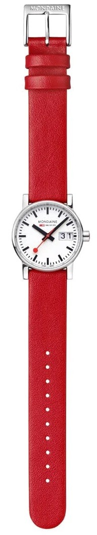 MONDAINE Evo2 MSE.30210.LCV jsou dámské elegantní bateriové hodinky na červeném řemínku z veganské kůže s trnovou sponou. Pouzdro z nerezové oceli má průměr 30 milimetrů. Přehledný bílý číselník s ukazatelem data na třetí hodině je chráněn safírovým sklíčkem a je inspirován ikonickými nádražními hodinami s červenou sekundovou ručkou. Pohon hodinek zajišťuje quartzový strojek Ronda 509. S vodotěsností 3 ATM jsou hodinky odolné proti dešti a při mytí rukou.