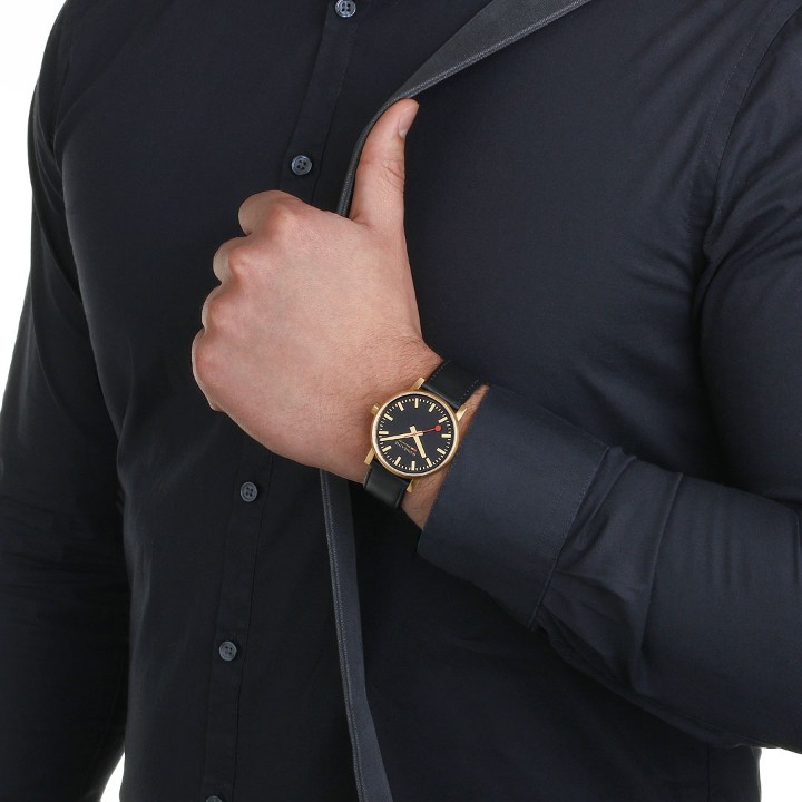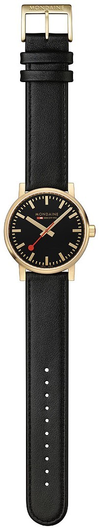 MONDAINE Evo2 MSE.40122.LB jsou pánské elegantní bateriové hodinky na černém řemínku z veganské kůže s trnovou sponou. Pouzdro z nerezové oceli s povrchovou PVD úpravou ve zlaté barvě má průměr 40 milimetrů. Přehledný černý číselník je chráněn safírovým sklíčkem a je inspirován ikonickými nádražními hodinami s červenou sekundovou ručkou. Pohon hodinek zajišťuje quartzový strojek Ronda 513. S vodotěsností 3 ATM jsou hodinky odolné proti dešti a při mytí rukou.
