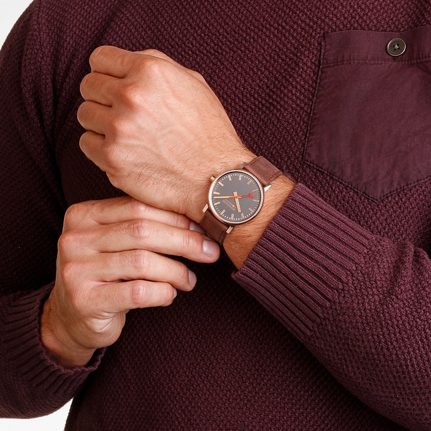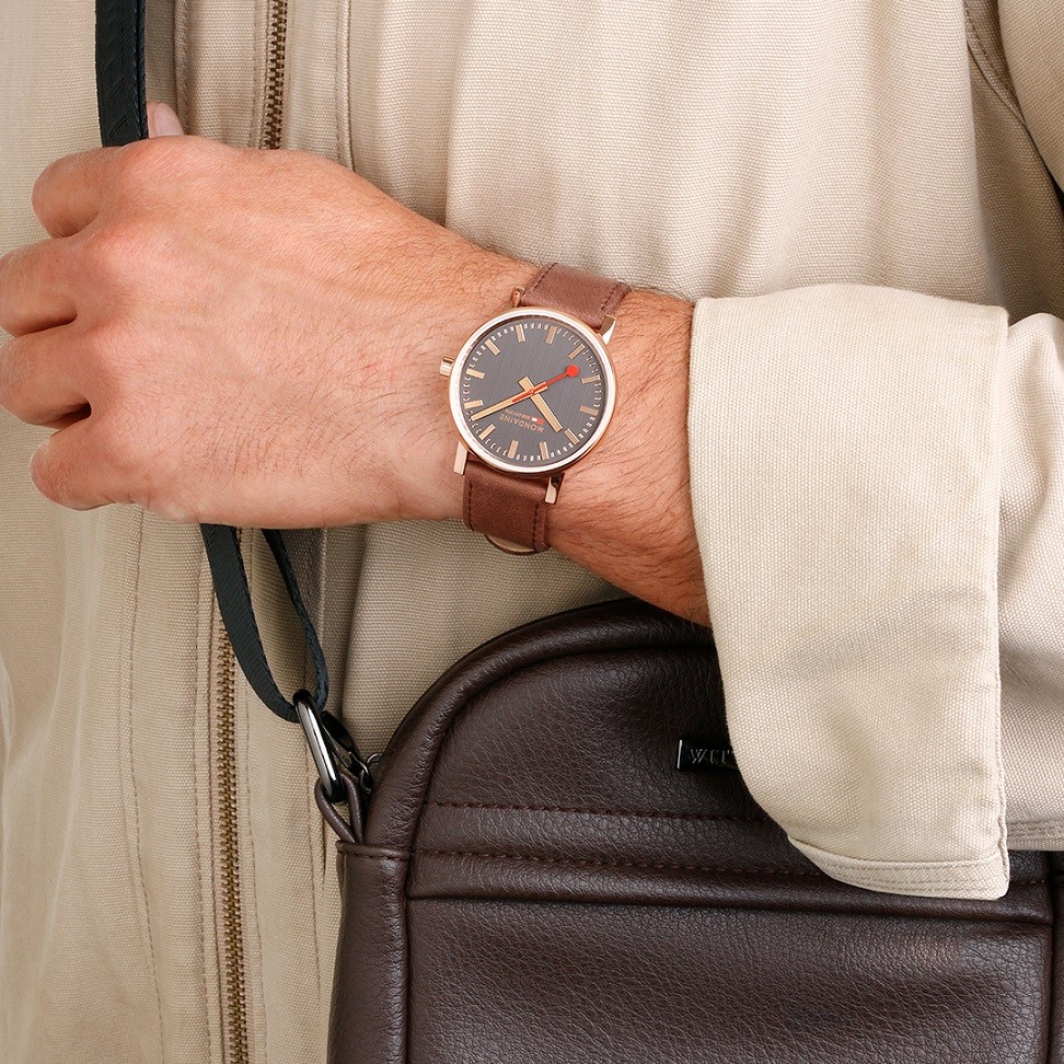 MONDAINE Evo2 MSE.40181.LG jsou pánské elegantní bateriové hodinky na hnědém řemínku z veganské kůže s trnovou sponou. Pouzdro z nerezové oceli s povrchovou PVD úpravou v barvě růžového zlata má průměr 40 milimetrů. Přehledný antracitový číselník s vertikální texturou je chráněn safírovým sklíčkem a je inspirován ikonickými nádražními hodinami s červenou sekundovou ručkou. Pohon hodinek zajišťuje quartzový strojek Ronda 513. S vodotěsností 3 ATM jsou hodinky odolné proti dešti a při mytí rukou.