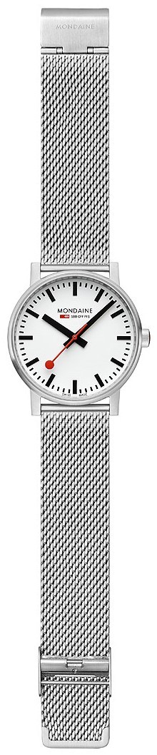 MONDAINE Evo2 MSE.43110.SJ jsou pánské elegantní bateriové hodinky na ocelovém milánském tahu s posuvnou sponou. Pouzdro z nerezové oceli má průměr 43 milimetrů. Přehledný bílý číselník je chráněn safírovým sklíčkem a je inspirován ikonickými nádražními hodinami s červenou sekundovou ručkou. Pohon hodinek zajišťuje quartzový strojek Ronda 513. S vodotěsností 3 ATM jsou hodinky odolné proti dešti a při mytí rukou.