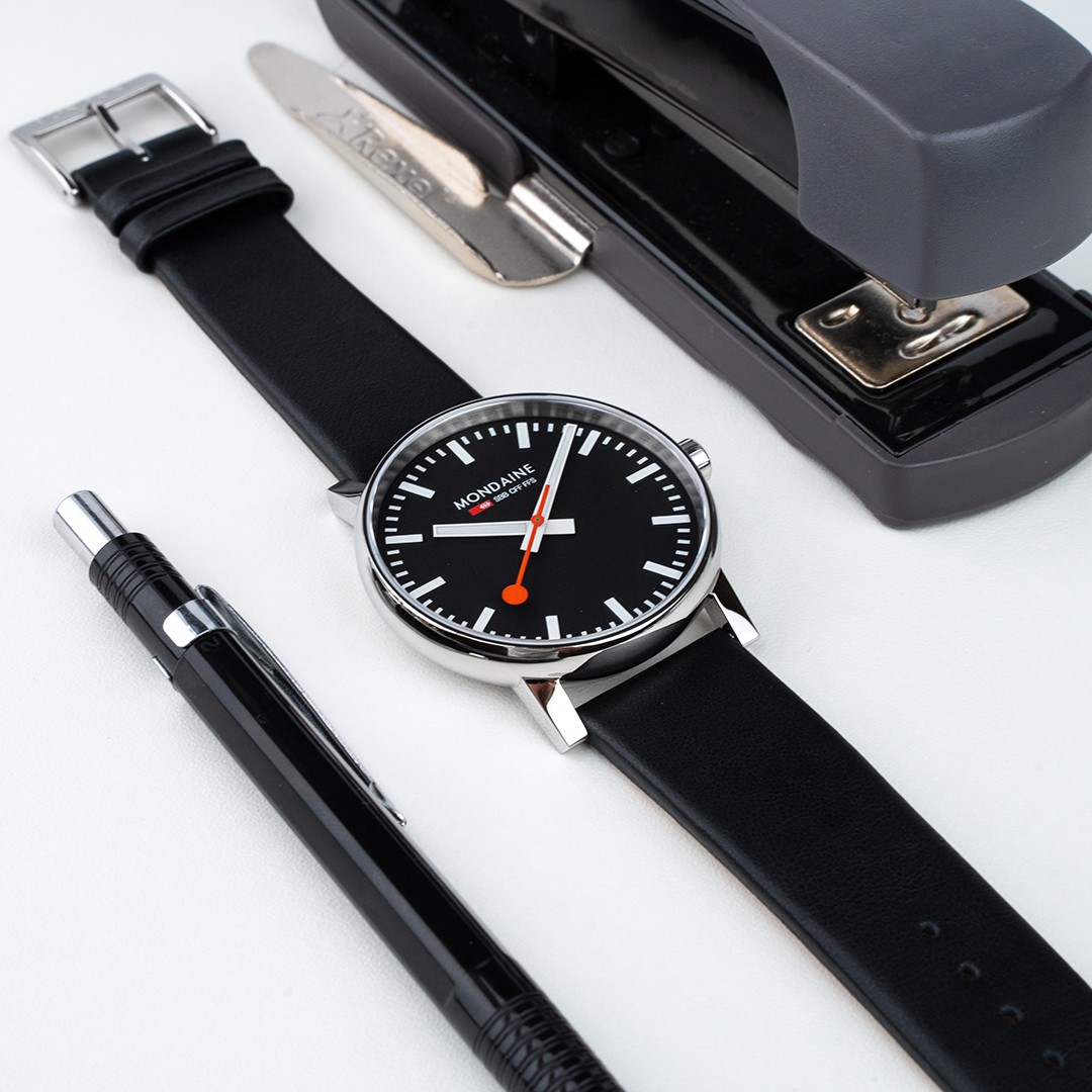 MONDAINE Evo2 MSE.43120.LB jsou pánské elegantní bateriové hodinky na černém řemínku z veganské kůže s trnovou sponou. Pouzdro z nerezové oceli má průměr 43 milimetrů. Přehledný černý číselník je chráněn safírovým sklíčkem a je inspirován ikonickými nádražními hodinami s červenou sekundovou ručkou. Pohon hodinek zajišťuje quartzový strojek Ronda 513. S vodotěsností 3 ATM jsou hodinky odolné proti dešti a při mytí rukou.