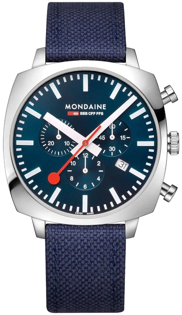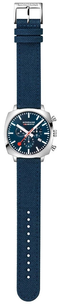 MONDAINE Grand Cushion MSL.41440.LD.SET jsou pánské sportovní bateriové hodinky na modrém textilním řemínku z recyklovaných PET lahví s korkovou podšívkou a trnovou sponou. Hranaté pouzdro z nerezové oceli je široké 41 milimetrů. Modrý číselník s efektem slunečního brusu, stopkami a ukazatelem data je chráněn safírovým sklíčkem s antireflexní vrstvou a je inspirován ikonickými nádražními hodinami s červenou sekundovou ručkou. Ručičky disponují luminiscenčním nátěrem Super-LumiNova®, který garantuje perfektní čitelnost za zhoršených světelných podmínek. Pohon hodinek zajišťuje quartzový strojek Ronda 5030. S vodotěsností 5 ATM jsou hodinky odolné proti dešti a při sprchování. Součástí balení je navíc ocelový milánský tah.