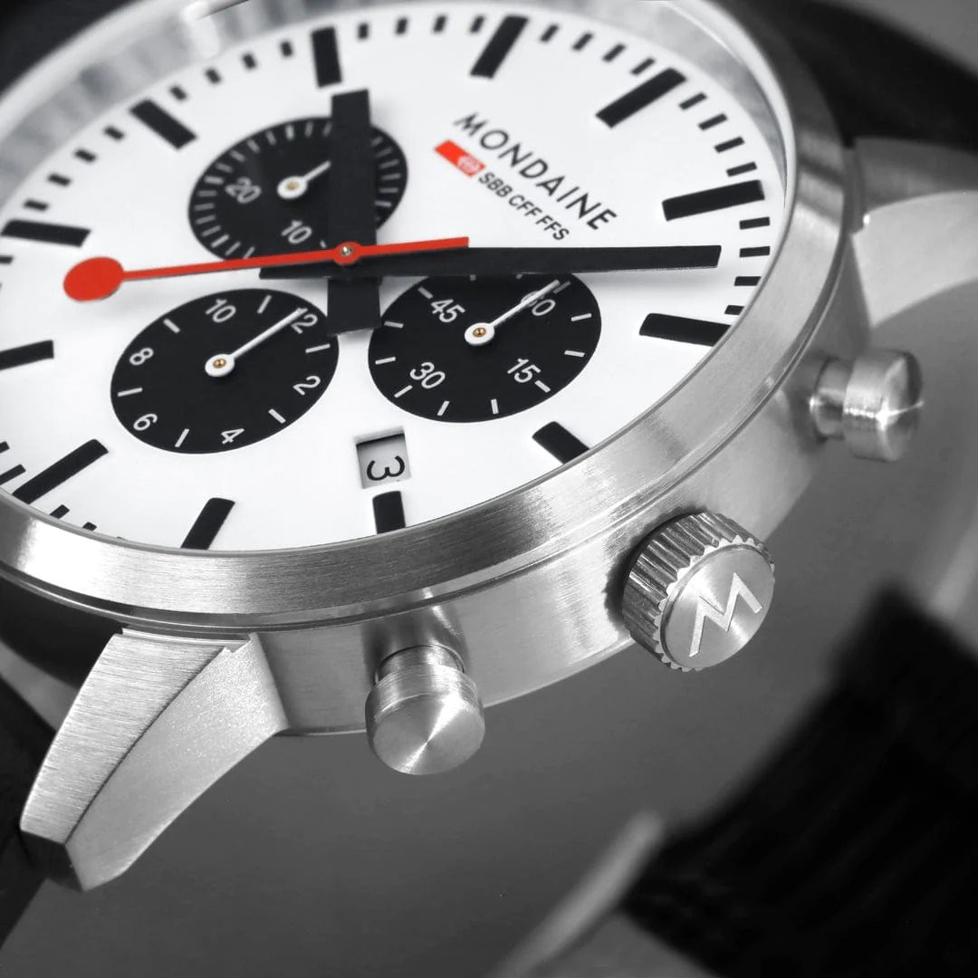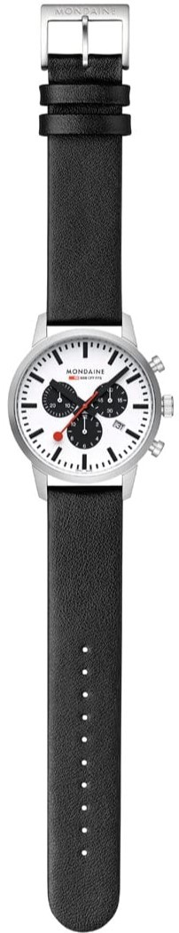 MONDAINE Neo MSD.41410.LBV jsou pánské sportovně elegantní bateriové hodinky na černém řemínku z veganské kůže s trnovou sponou. Pouzdro z nerezové oceli má průměr 41 milimetrů. Bílo-černý číselník se stopkami a ukazatelem data je chráněn safírovým sklíčkem s antireflexní vrstvou a je inspirován ikonickými nádražními hodinami s červenou sekundovou ručkou. Pohon hodinek zajišťuje quartzový strojek Ronda 5030. S vodotěsností 5 ATM jsou hodinky odolné proti dešti a při sprchování.