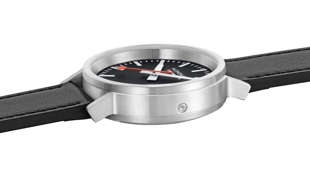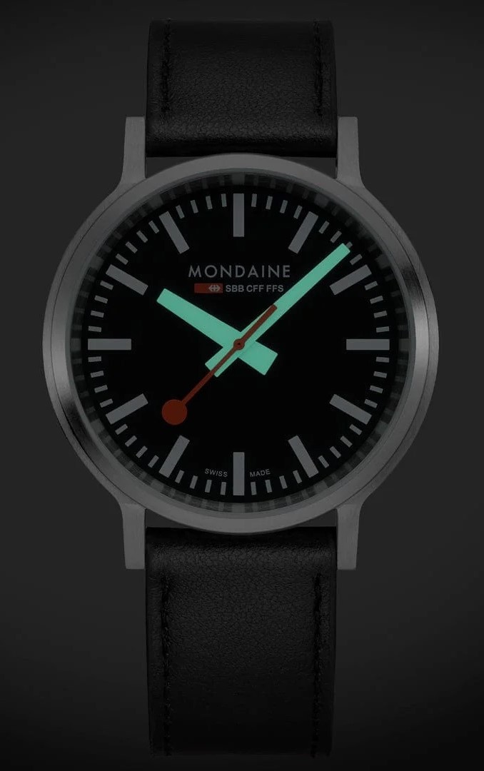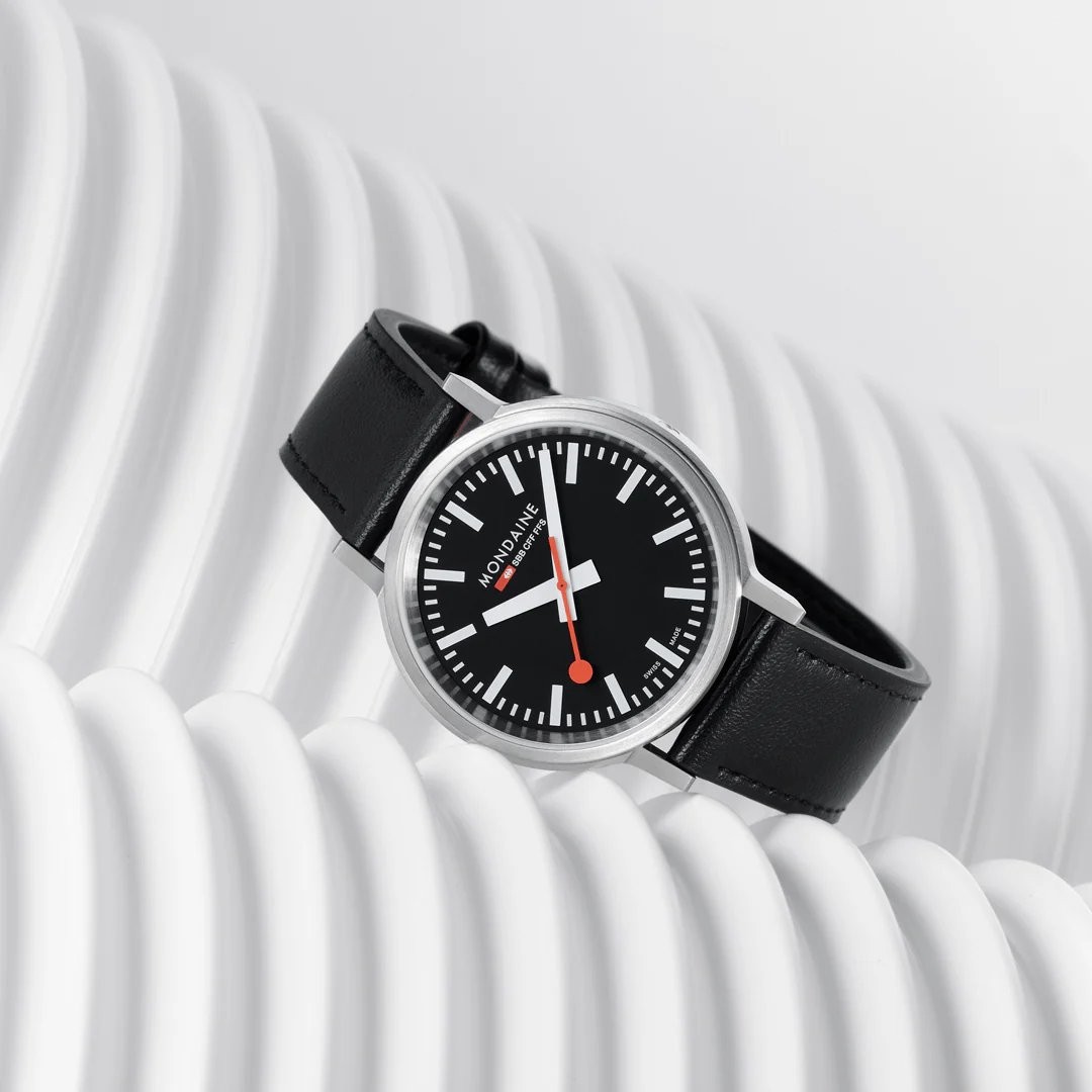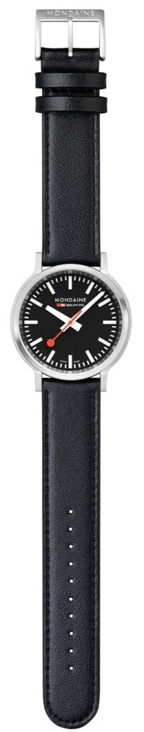 MONDAINE Stop2go MST.41020.LBV.2SE jsou pánské elegantní hodinky na černém řemínku z veganské kůže s trnovou sponou. Pouzdro z nerezové oceli má průměr 41 milimetrů. Přehledný černý číselník je chráněn odolným safírovým sklíčkem s antireflexní vrstvou a je inspirován ikonickými nádražními hodinami s červenou sekundovou ručkou. Ručičky disponují luminiscenčním nátěrem Super-LumiNova®, který po nasvícení garantuje perfektní čitelnost za zhoršených světelných podmínek. Pohon hodinek zajišťuje quartzový strojek se systémem Stop2go, který je založen na oběhnutí sekundové ručičky v 58 sekundách. Potom se na 2 sekundy zastaví a následně minutová ručka poskočí o celou minutu vpřed. Stejný systém je využíván v nádražních hodinách Švýcarských Státních Drah (SBB) již od roku 1940, má zajistit přesnou synchronizaci času na všech nádražích. S vodotěsností 3 ATM jsou hodinky odolné proti dešti a při mytí rukou. Hodinky jsou dodávány s perem pro snadné nastavení času a vyrovnání ručiček.