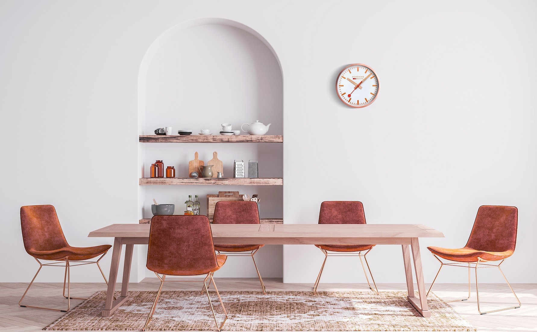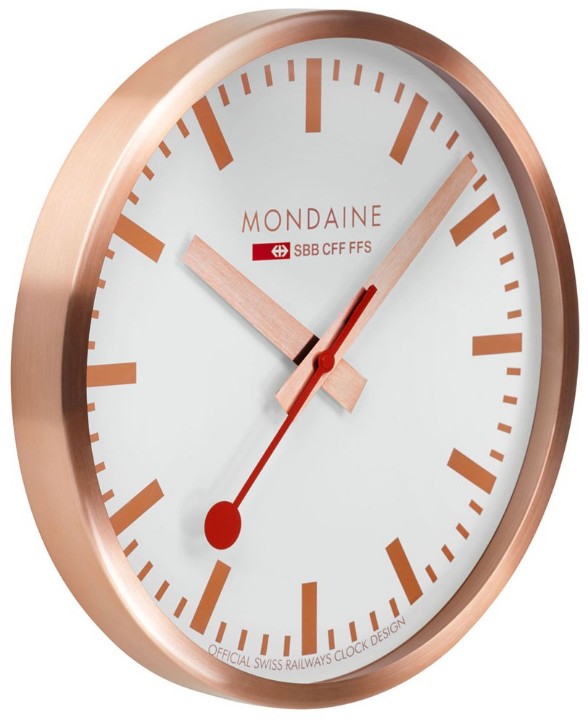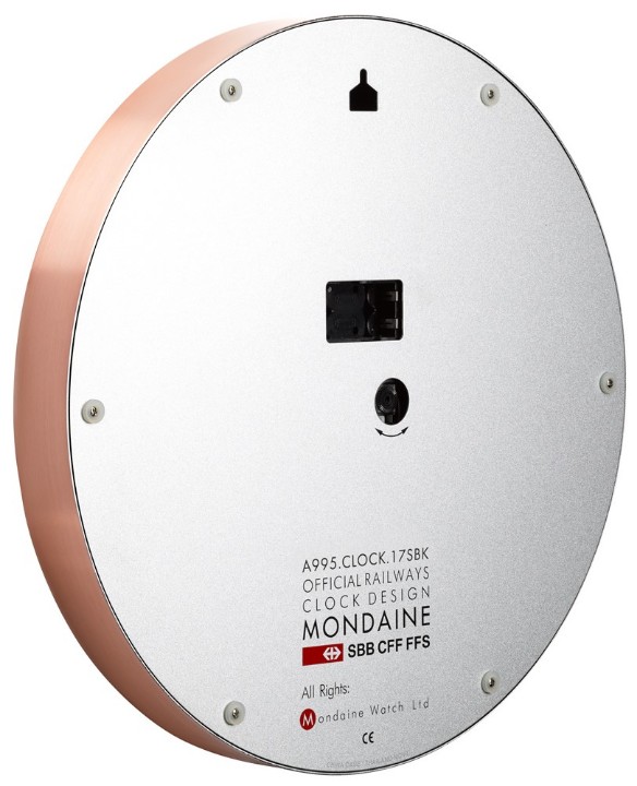 MONDAINE A995.CLOCK.17SBK jsou nástěnné hodiny s hliníkovým pouzdrem potaženým mědí v barvě růžového zlata o průměru 400 milimetrů. Číselník v matné bílé barvě je chráněn tvrzeným minerálním sklem a je inspirován ikonickými nádražními hodinami s červenou sekundovou ručkou. Chod hodin zajišťuje quartzový strojek.