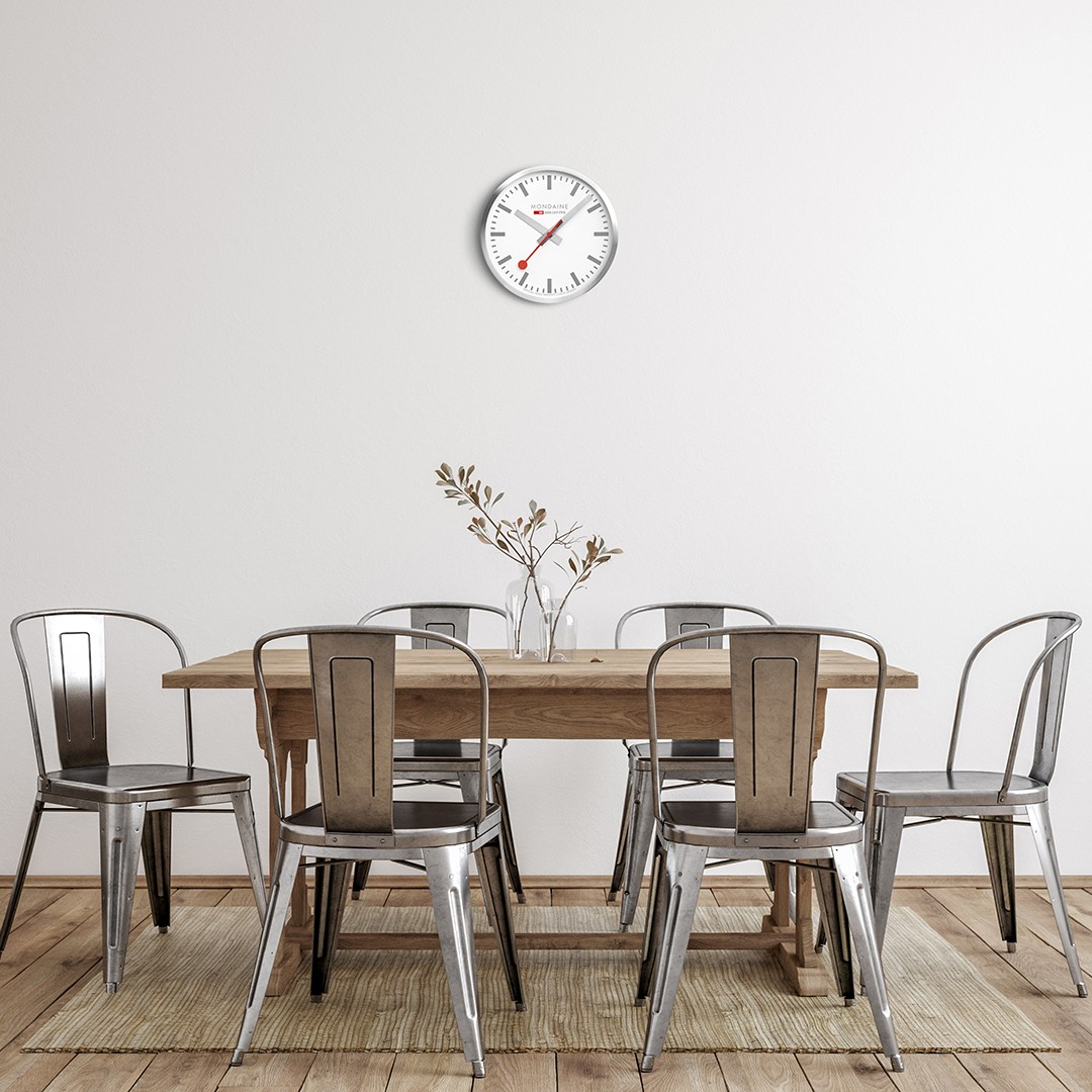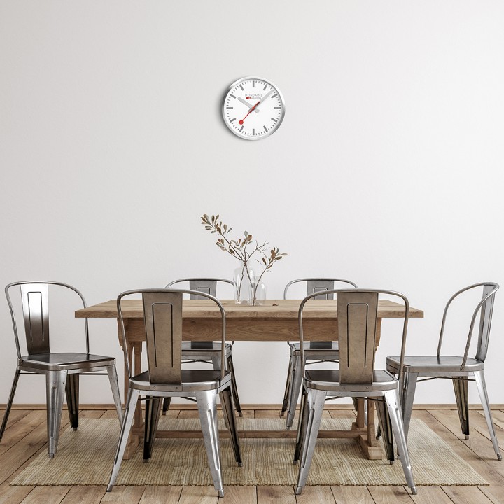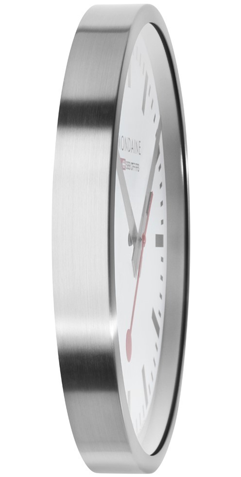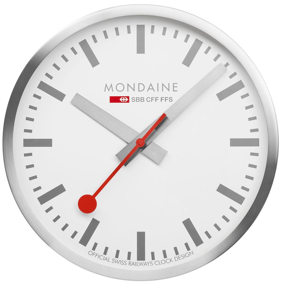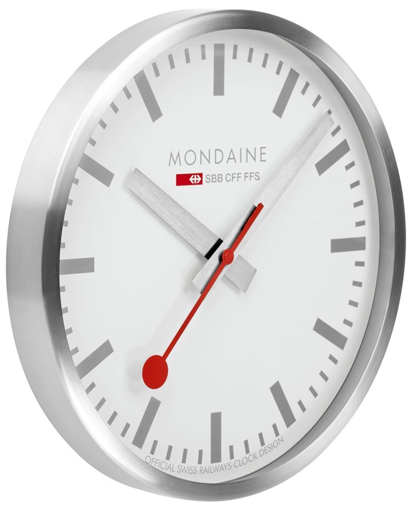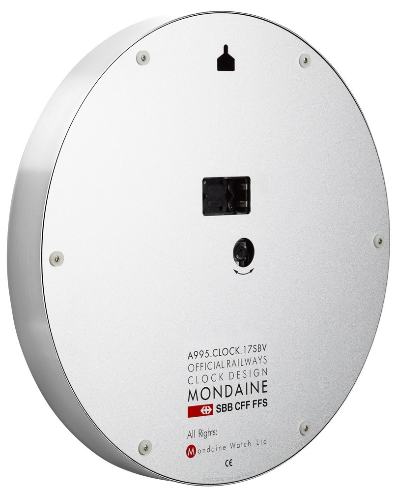 MONDAINE A995.CLOCK.17SBV jsou nástěnné hodiny s hliníkovým pouzdrem o průměru 400 milimetrů. Číselník v matné bílé barvě je chráněn tvrzeným minerálním sklem a je inspirován ikonickými nádražními hodinami s červenou sekundovou ručkou. Chod hodin zajišťuje quartzový strojek.