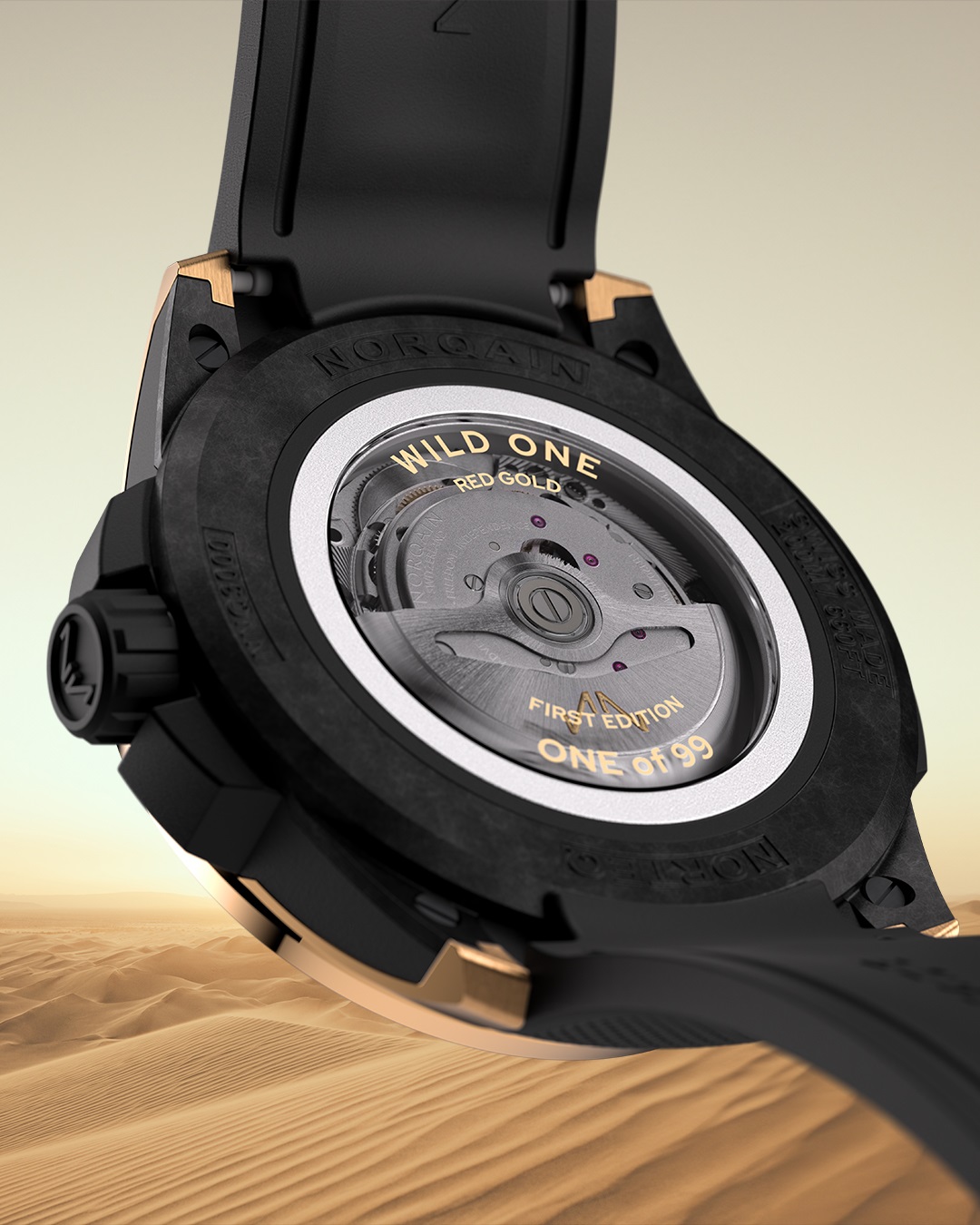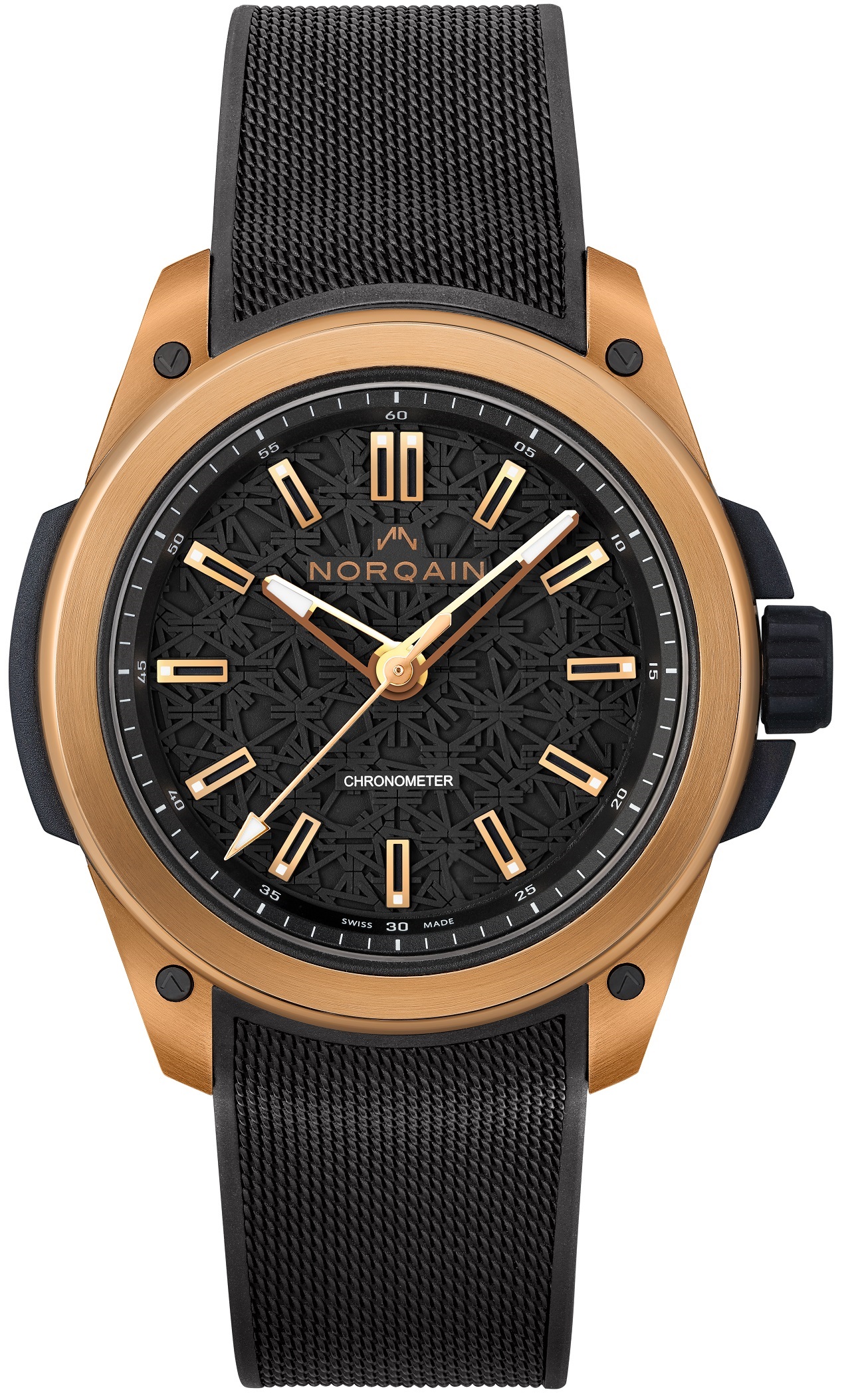 Model od rodinné švýcarské značky NORQAIN Wild ONE. Tyto hodinky mají pouzdro vyrobené částečně z červeného zlata a částečně z inovativního materiálu NORTEQ. Tento patentovaný materiál je 6x lehčí než ocel, 3,5x lehčí než titan. NORTEQ překonává standardní černý odstín uhlíkových vláken používaných v hodinářském průmyslu a pomocí průlomového procesu nabízí různé kompozitní barvy.