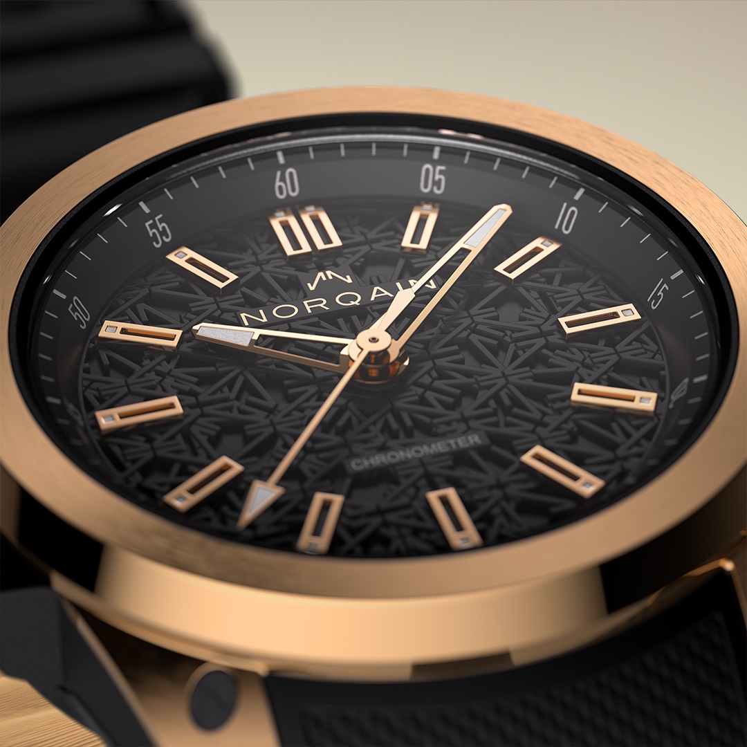 Model od rodinné švýcarské značky NORQAIN Wild ONE. Tyto hodinky mají pouzdro vyrobené částečně z červeného zlata a částečně z inovativního materiálu NORTEQ. Tento patentovaný materiál je 6x lehčí než ocel, 3,5x lehčí než titan. NORTEQ překonává standardní černý odstín uhlíkových vláken používaných v hodinářském průmyslu a pomocí průlomového procesu nabízí různé kompozitní barvy.