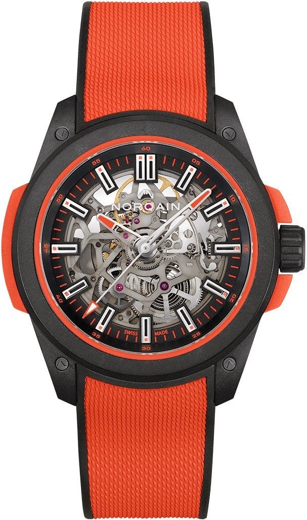 Model od rodinné švýcarské značky NORQAIN Wild ONE. Tyto hodinky jsou vyrobeny z inovativního materiálu NORTEQ – zcela nový koncept sportovních hodinek, které jsou vyrobeny z patentovaného materiálu, jenž je 6x lehčí než ocel, 3,5x lehčí než titan a je k dispozici v různých barevných variantách. NORTEQ překonává standardní černý odstín uhlíkových vláken používaných v hodinářském průmyslu a pomocí průlomového procesu nabízí různé kompozitní barvy.