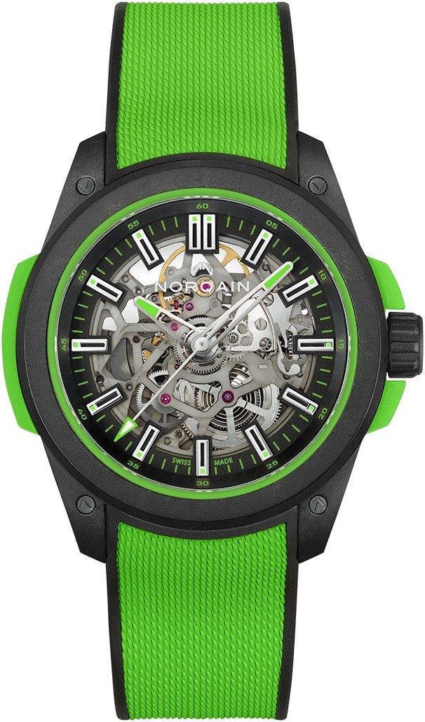Model od rodinné švýcarské značky NORQAIN Wild ONE. Tyto hodinky jsou vyrobeny z inovativního materiálu NORTEQ – zcela nový koncept sportovních hodinek, které jsou vyrobeny z patentovaného materiálu, jenž je 6x lehčí než ocel, 3,5x lehčí než titan a je k dispozici v různých barevných variantách. NORTEQ překonává standardní černý odstín uhlíkových vláken používaných v hodinářském průmyslu a pomocí průlomového procesu nabízí různé kompozitní barvy.