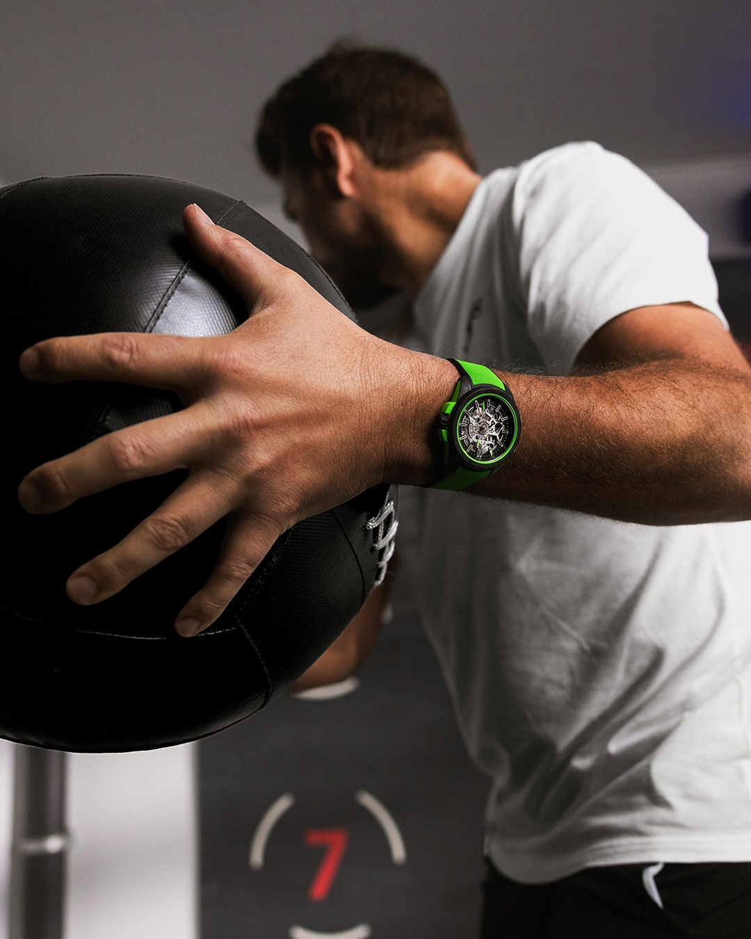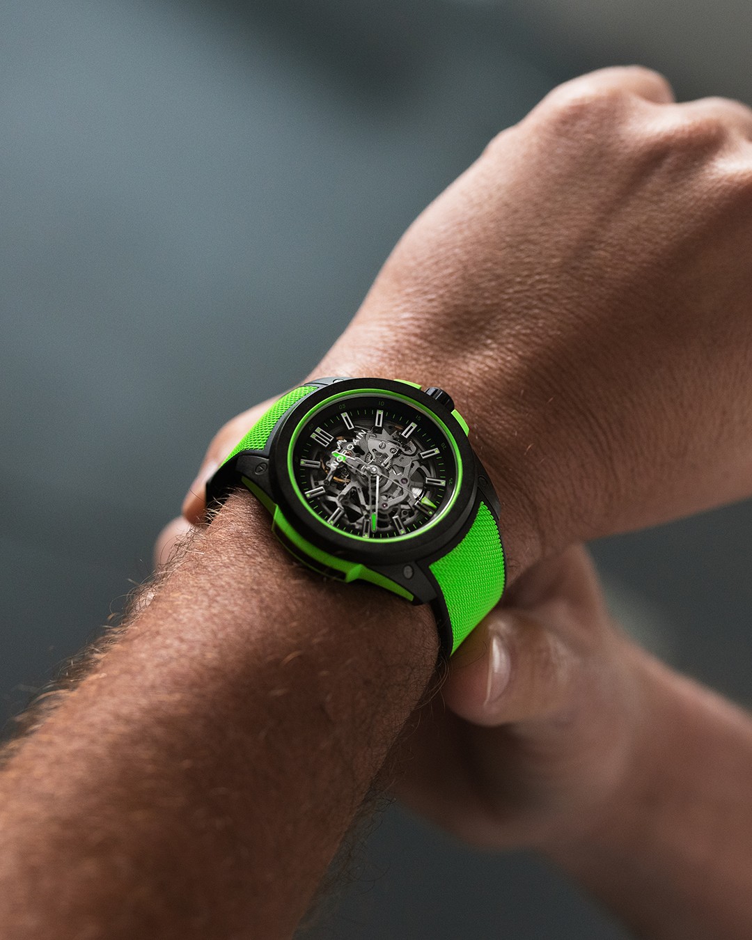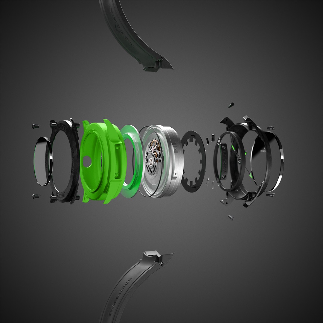 Na 100% švýcarských hodinkách z kolekce Wild ONE vynikne kromě jejich neuvěřitelné lehkosti především jejich inovativní konstrukce. Manufakturní kalibr N08S s automatickým nátahem, jehož rezerva chodu činí až 41 hodin, je uschován v titanovém pouzdře, které je obklopeno kaučukovou vrstvou, jejíž funkce je tlumení nárazů. To celé je chráněné „klecí“ z patentovaného materiálu NORTEQ a zabezpečené šrouby, které byly vyrobeny na zakázku přímo pro tento koncept.