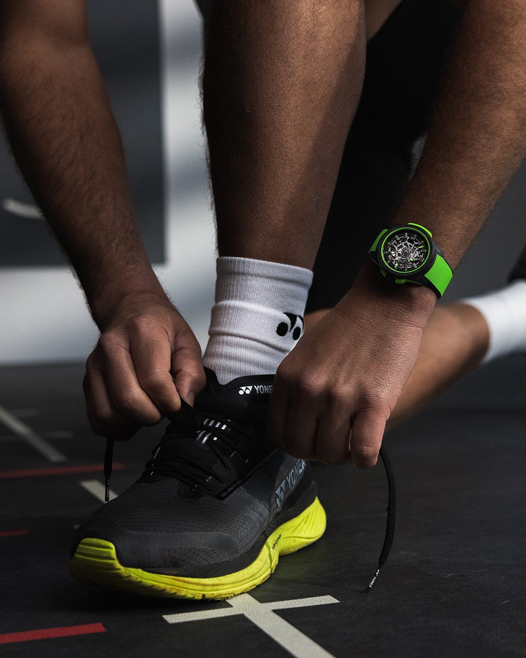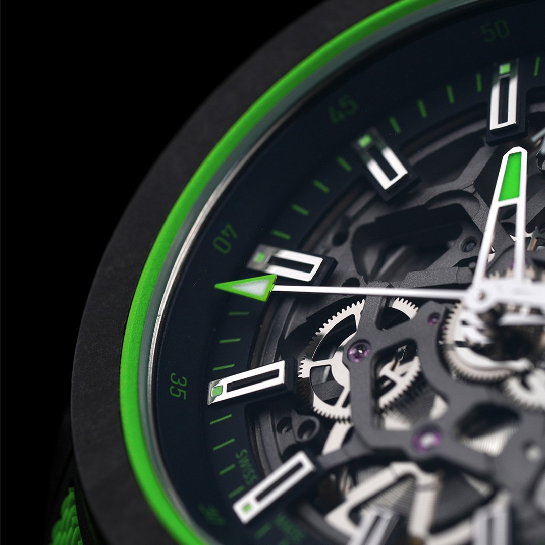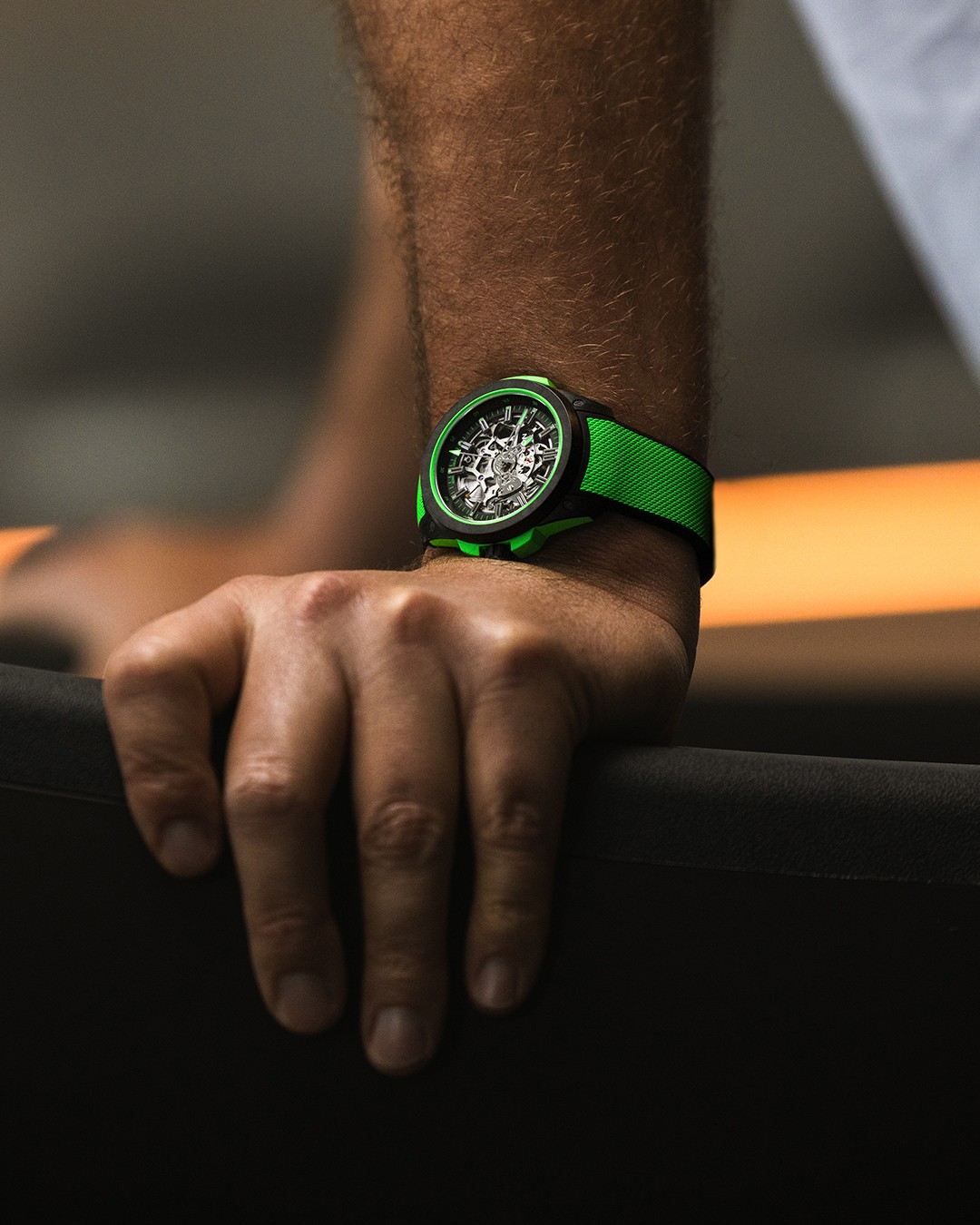 Na 100% švýcarských hodinkách z kolekce Wild ONE vynikne kromě jejich neuvěřitelné lehkosti především jejich inovativní konstrukce. Manufakturní kalibr N08S s automatickým nátahem, jehož rezerva chodu činí až 41 hodin, je uschován v titanovém pouzdře, které je obklopeno kaučukovou vrstvou, jejíž funkce je tlumení nárazů. To celé je chráněné „klecí“ z patentovaného materiálu NORTEQ a zabezpečené šrouby, které byly vyrobeny na zakázku přímo pro tento koncept.