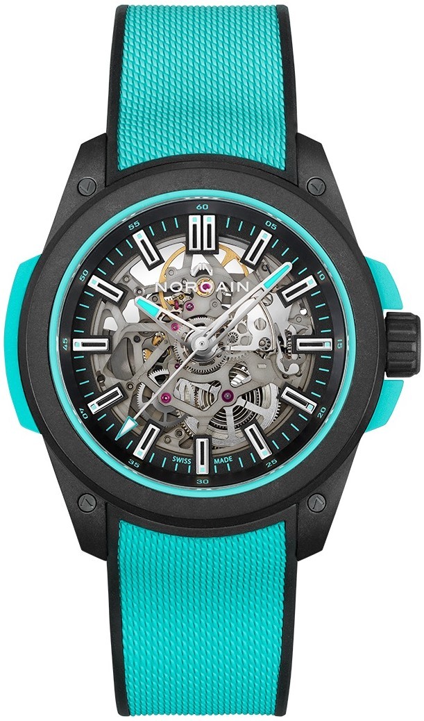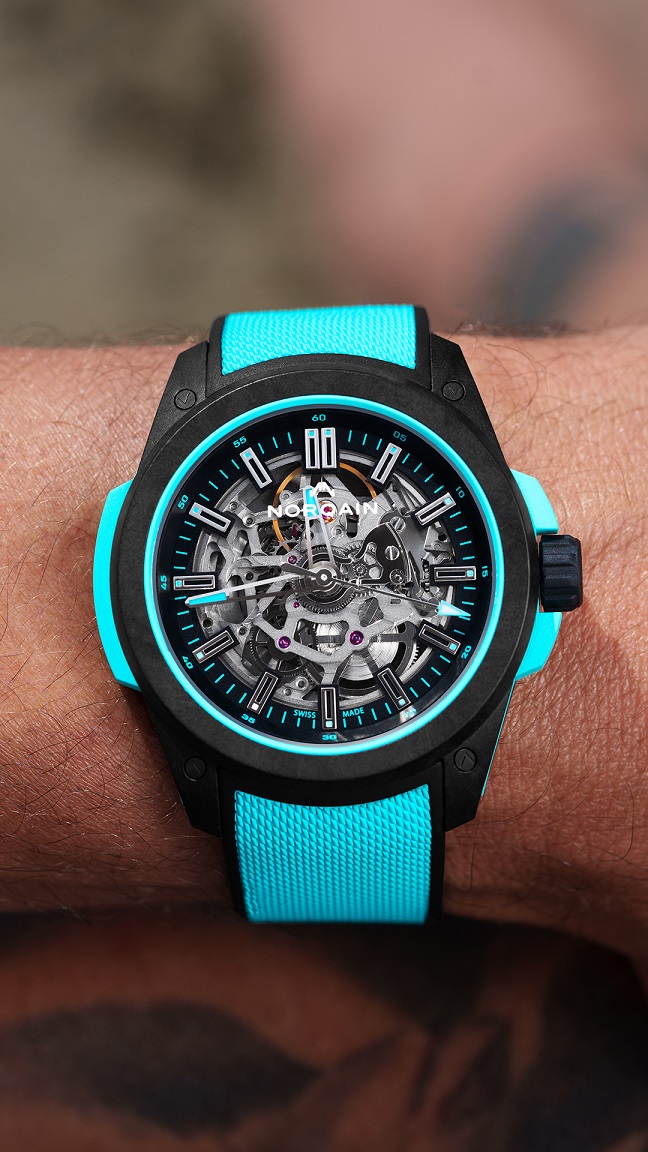 Model od rodinné švýcarské značky NORQAIN Wild ONE. Tyto hodinky jsou vyrobeny z inovativního materiálu NORTEQ – zcela nový koncept sportovních hodinek, které jsou vyrobeny z patentovaného materiálu, jenž je 6x lehčí než ocel, 3,5x lehčí než titan a je k dispozici v různých barevných variantách. NORTEQ překonává standardní černý odstín uhlíkových vláken používaných v hodinářském průmyslu a pomocí průlomového procesu nabízí různé kompozitní barvy.