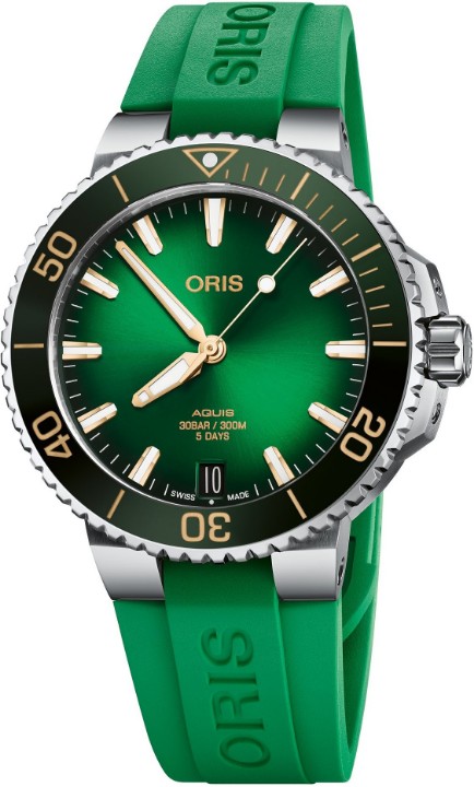 Oris Aquis Date 01 400 7769 4127-07 4 22 77FC jsou pánské automatické hodinky na zeleném kaučukovém řemínku s překlápěcí sponou. Pouzdro z nerezové oceli má průměr 41,5 milimetru, průhledné dýnko a jednosměrně otočnou lunetu s keramickou vložkou s potápěčskou stupnicí. Zelený číselník s efektem slunečního brusu a indikací data na šesté hodině je chráněn odolným safírovým sklem s antireflexní vrstvou. Ručičky, indexy a část lunety jsou pokryty luminiscenčním nátěrem Super-LumiNova®, který garantuje perfektní čitelnost za zhoršených světelných podmínek. Pohon hodinek zajišťuje mechanický manufakturní strojek Oris 400 s automatickým nátahem a nadstandardní rezervou chodu ve výši 5 dní. Strojek disponuje dvěma pérovníky a chybí mu tradiční červený rotor, čímž se kalibr 400 odlišuje od modelů značky s běžnými strojky. Kromě pětidenní rezervy chodu nabízí strojek ještě zvýšenou odolnost vůči magnetismu, čemuž napomáhají mimo jiné kotva a krokové kolo z křemíku. Oris u tohoto strojku doporučuje servisní interval 10 let, tedy dvojnásobek doporučené doby u běžných mechanických hodinek, a především strojku věří natolik, že u něj poskytuje záruku taktéž ve výši 10 let! Tento strojek s funkcí hackingu, který lze v případě potřeby natahovat i ručně pomocí signované šroubovací korunky. Vodotěsnost hodinek činí 30 ATM a jsou tak vhodnou volbou pro šnorchlování a potápění.