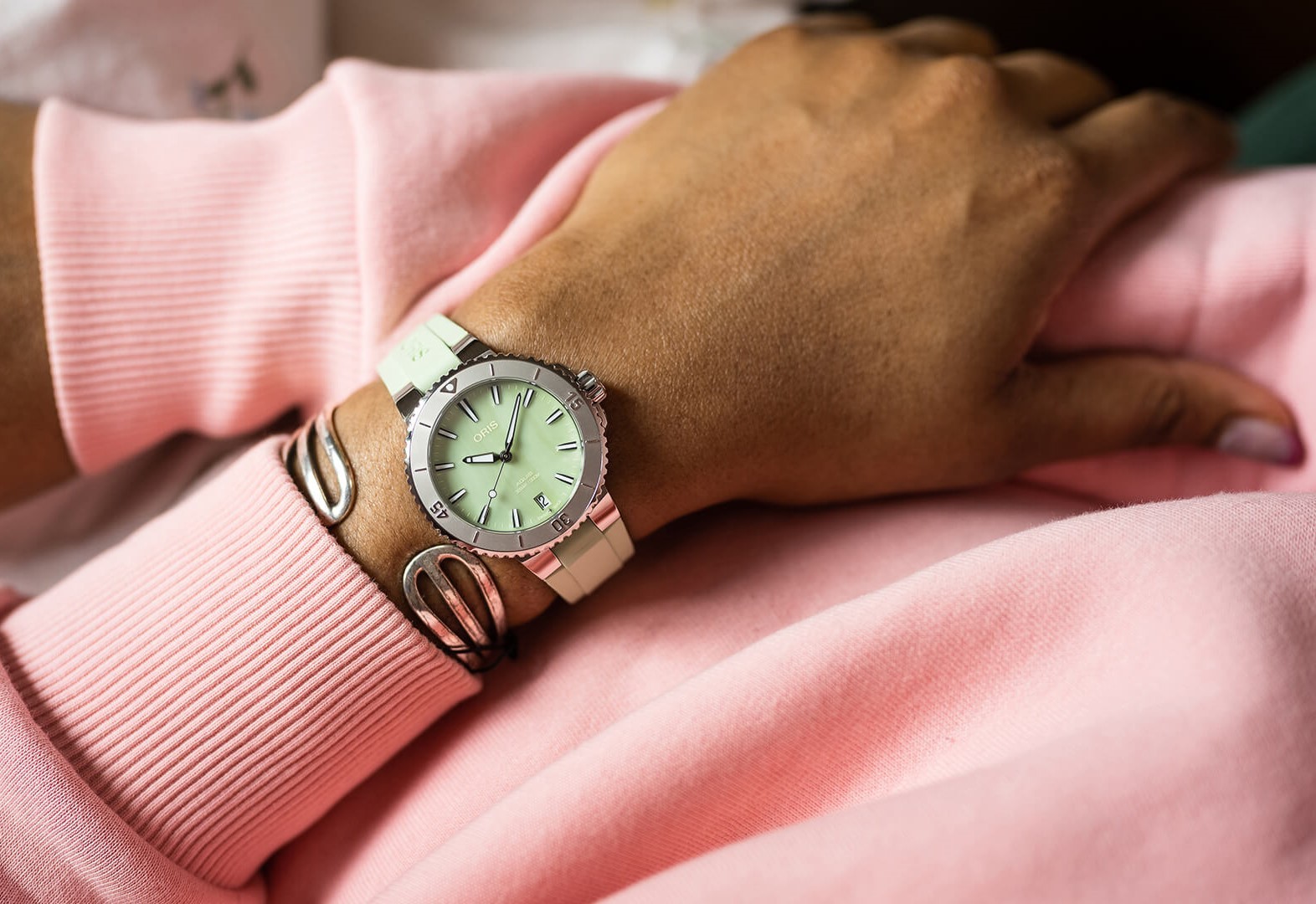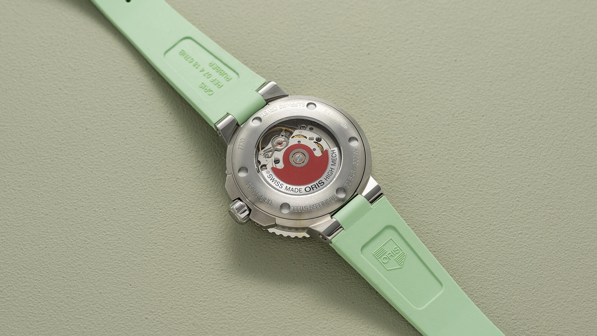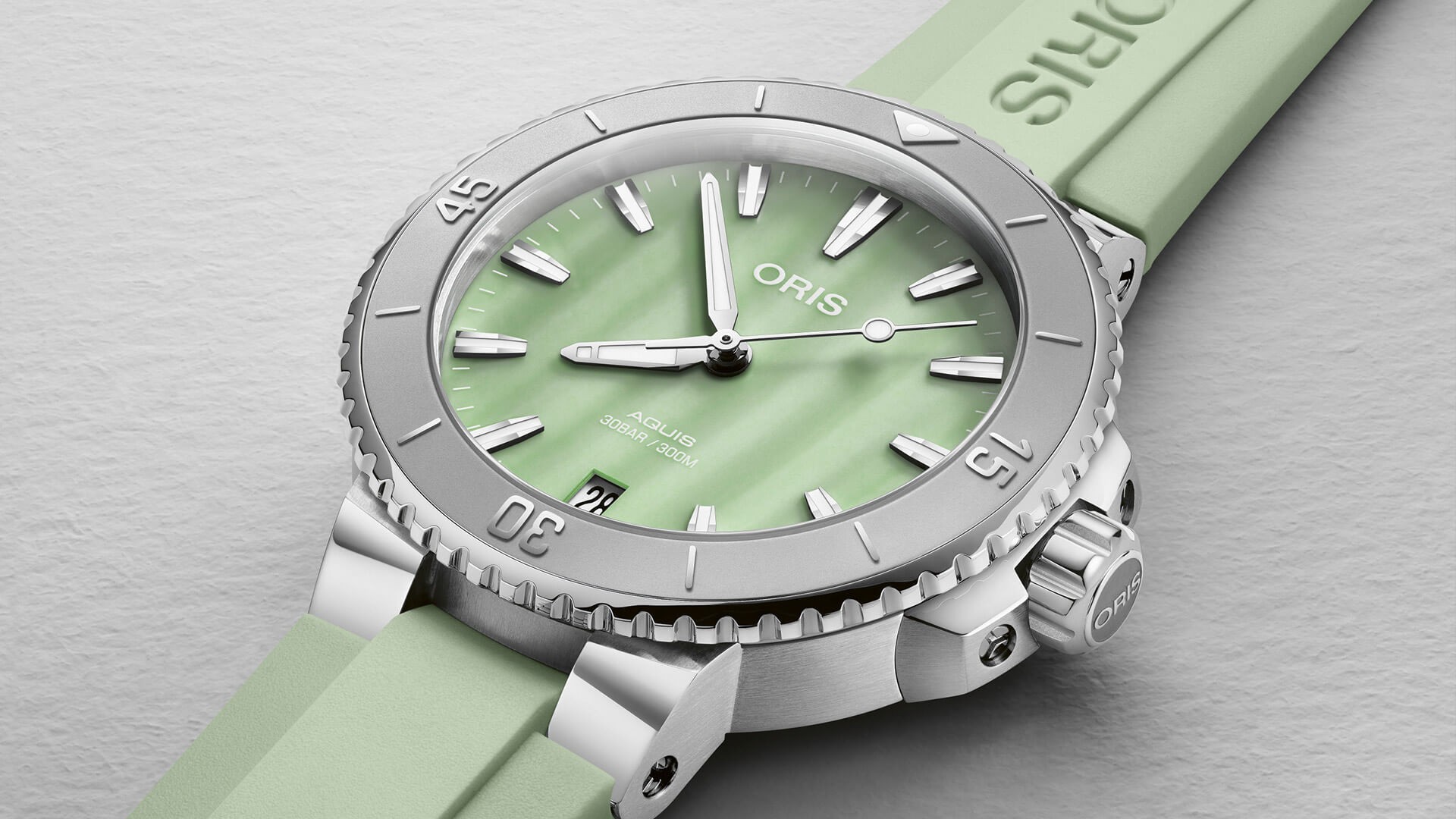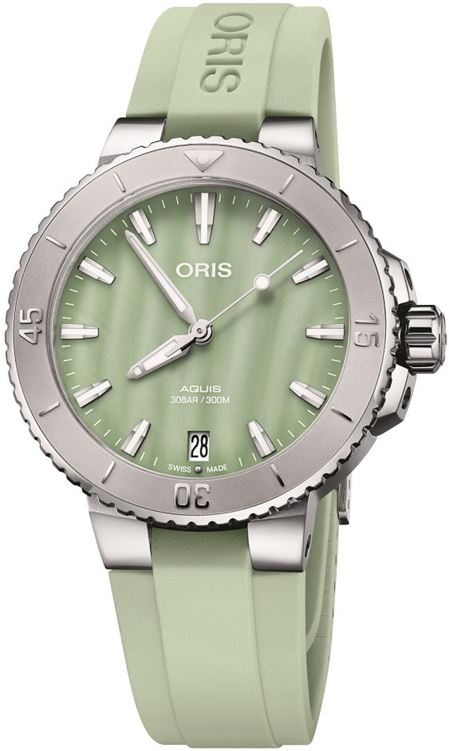 Oris Aquis Date 01 733 7770 4157-07 4 18 67FC jsou dámské automatické hodinky na zeleném kaučukovém řemínku s překlápěcí sponou. Pouzdro z nerezové oceli má průměr 36,5 milimetru, průhledné dýnko a jednosměrně otočnou lunetu s potápěčskou stupnicí. Zelený perleťový číselník s indikací data na šesté hodině je chráněn odolným safírovým sklem s antireflexní vrstvou a jeho krása vyniká zejména pod přímým světlem, kdy můžeme pozorovat hru barev perleti podobající se vodní hladině. Ručičky, indexy a část lunety jsou pokryty luminiscenčním nátěrem Super-LumiNova®, který garantuje perfektní čitelnost za zhoršených světelných podmínek. Pohon hodinek zajišťuje mechanický strojek Oris 733 s automatickým nátahem a rezervou chodu přibližně 38 hodin. Základem tohoto kalibru je Sellita SW200-1. Tento strojek s funkcí hackingu lze v případě potřeby natahovat i ručně pomocí signované šroubovací korunky. Vodotěsnost hodinek činí 30 ATM a jsou tak vhodnou volbou pro šnorchlování a potápění.