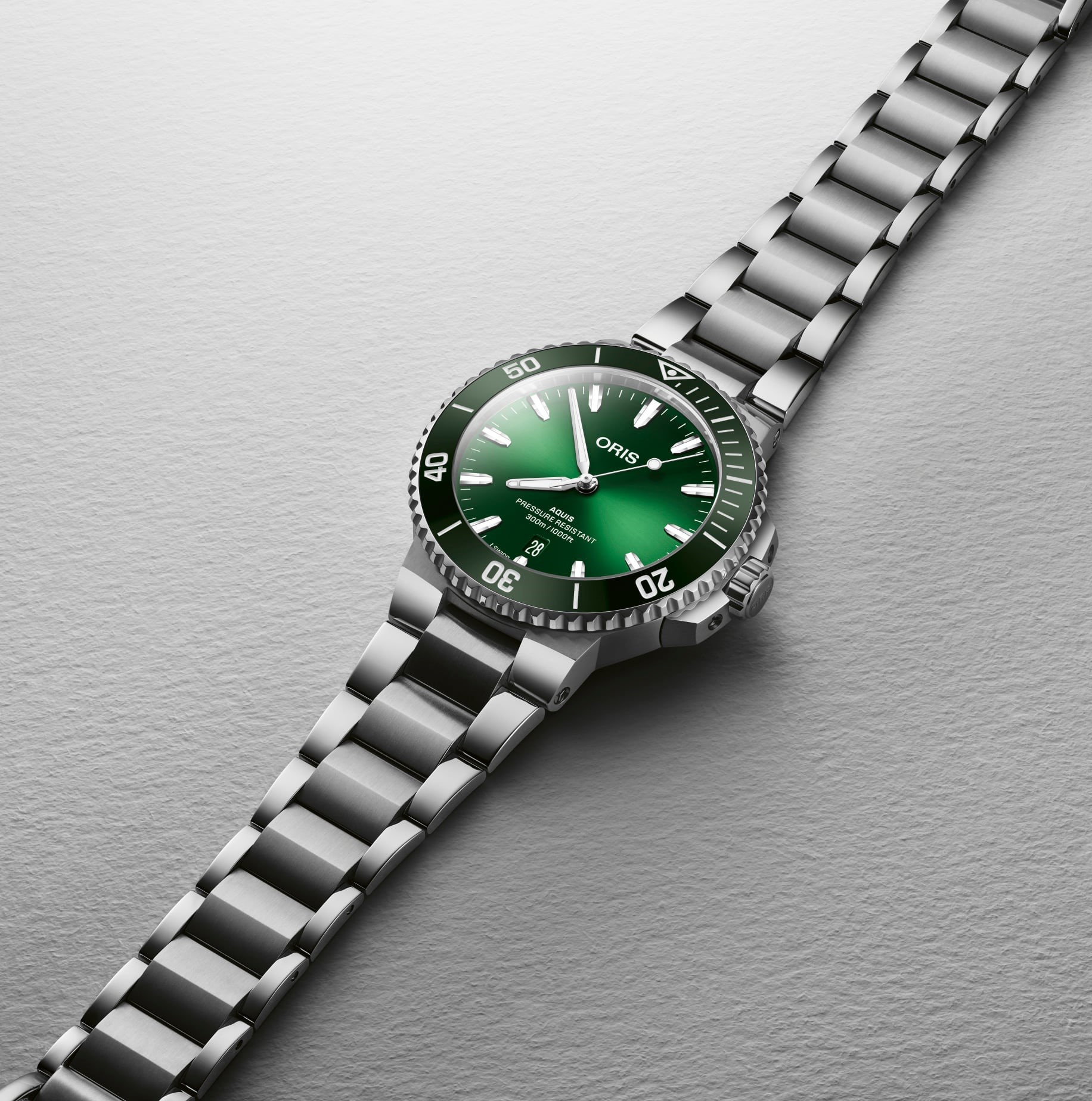 Oris Aquis Date 01 733 7787 4157-07 8 22 04PEB jsou pánské automatické hodinky na ocelovém náramku v kombinaci brusu a lesku s překlápěcí sponou. Pouzdro z nerezové oceli má průměr 41,5 milimetru, průhledné dýnko a jednosměrně otočnou lunetu s keramickou vložkou s potápěčskou stupnicí. Zelený číselník s efektem slunečního brusu a indikací data na šesté hodině je chráněn odolným safírovým sklem s antireflexní vrstvou. Ručičky, indexy a část lunety jsou pokryty luminiscenčním nátěrem Super-LumiNova®, který garantuje perfektní čitelnost za zhoršených světelných podmínek. Pohon hodinek zajišťuje mechanický strojek Oris 733 s automatickým nátahem a rezervou chodu přibližně 38 hodin. Základem tohoto kalibru je Sellita SW200-1. Tento strojek s funkcí hackingu lze v případě potřeby natahovat i ručně pomocí signované šroubovací korunky. Vodotěsnost hodinek činí 30 ATM a jsou tak vhodnou volbou pro šnorchlování a potápění.