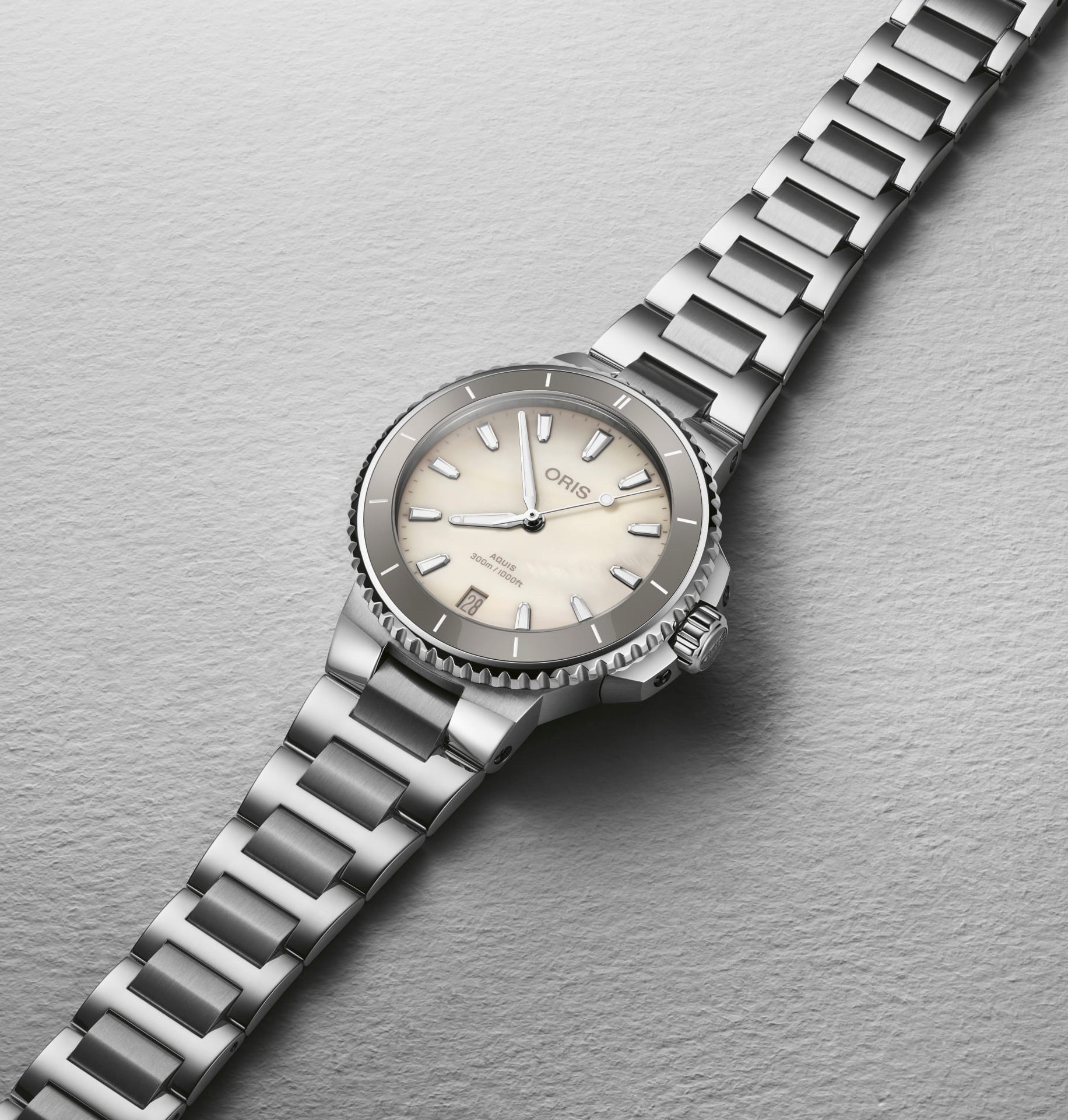 Oris Aquis Date 01 733 7792 4151-07 8 19 05P jsou dámské automatické hodinky na ocelovém náramku v kombinaci brusu a lesku s překlápěcí sponou. Pouzdro z nerezové oceli má průměr 36,5 milimetru, průhledné dýnko a jednosměrně otočnou lunetu s keramickou vložkou s potápěčskou stupnicí. Bílý perleťový číselník s indikací data na šesté hodině je chráněn odolným safírovým sklem s antireflexní vrstvou a jeho krása vyniká zejména pod přímým světlem, kdy můžeme pozorovat hru barev perleti. Ručičky a indexy jsou pokryty luminiscenčním nátěrem Super-LumiNova®, který garantuje perfektní čitelnost za zhoršených světelných podmínek. Pohon hodinek zajišťuje mechanický strojek Oris 733 s automatickým nátahem a rezervou chodu přibližně 38 hodin. Základem tohoto kalibru je Sellita SW200-1. Tento strojek s funkcí hackingu lze v případě potřeby natahovat i ručně pomocí signované šroubovací korunky. Vodotěsnost hodinek činí 30 ATM a jsou tak vhodnou volbou pro šnorchlování a potápění.