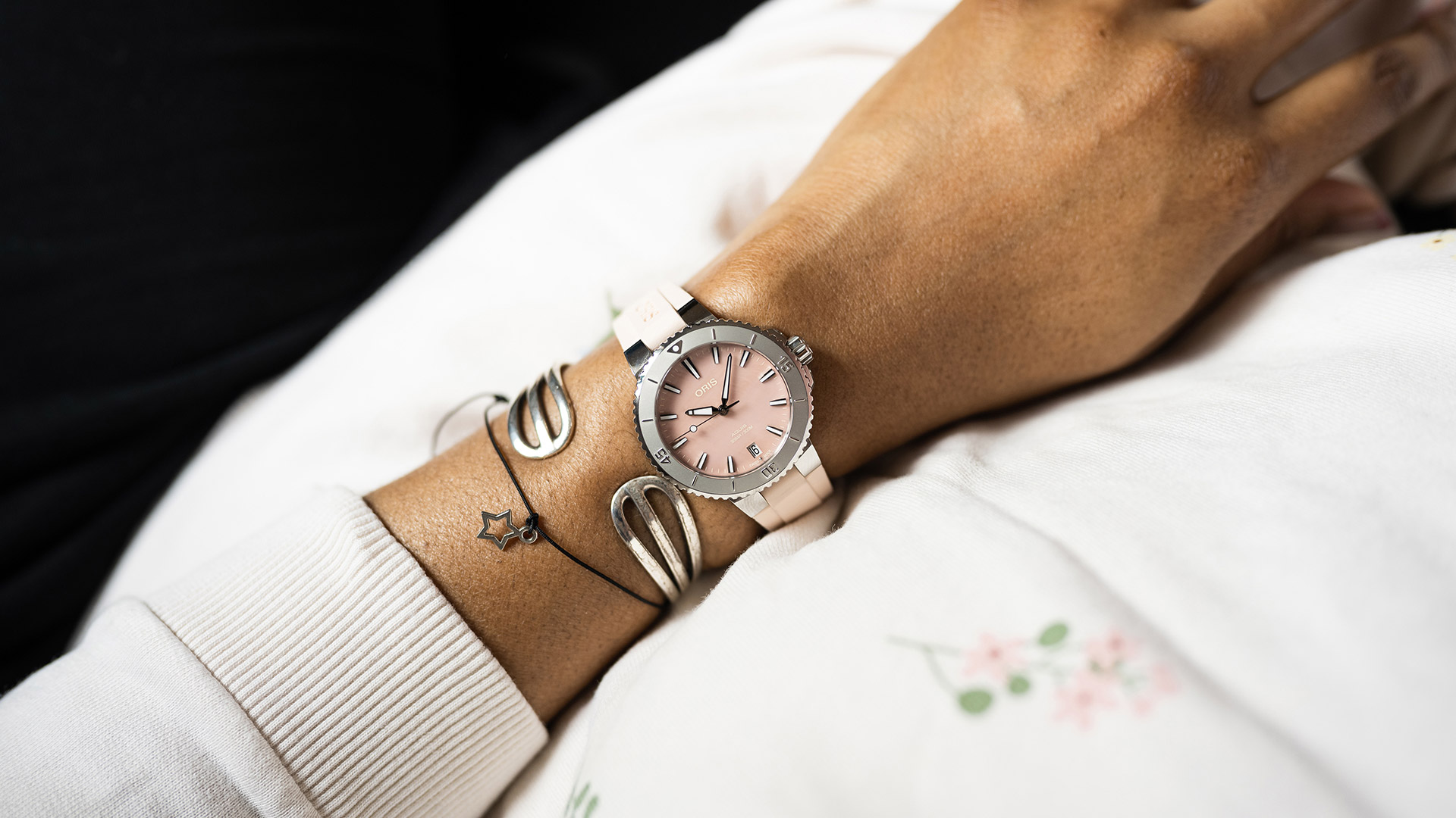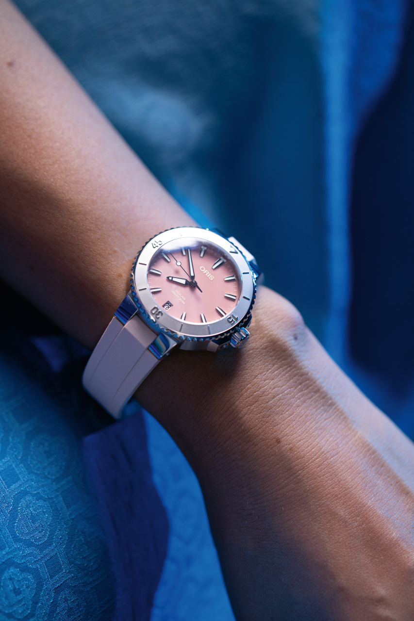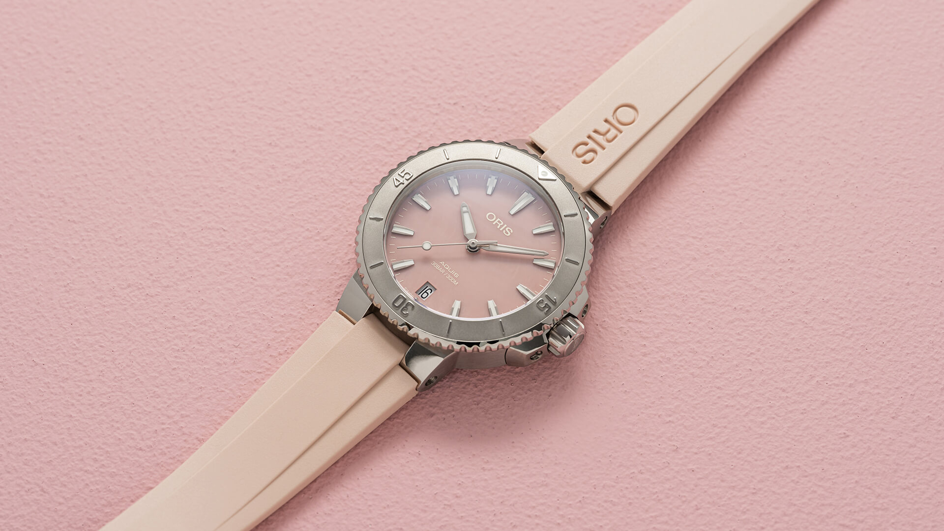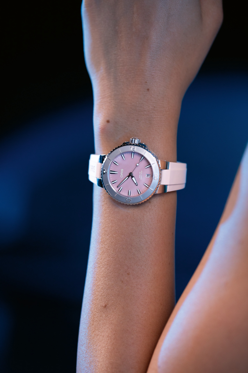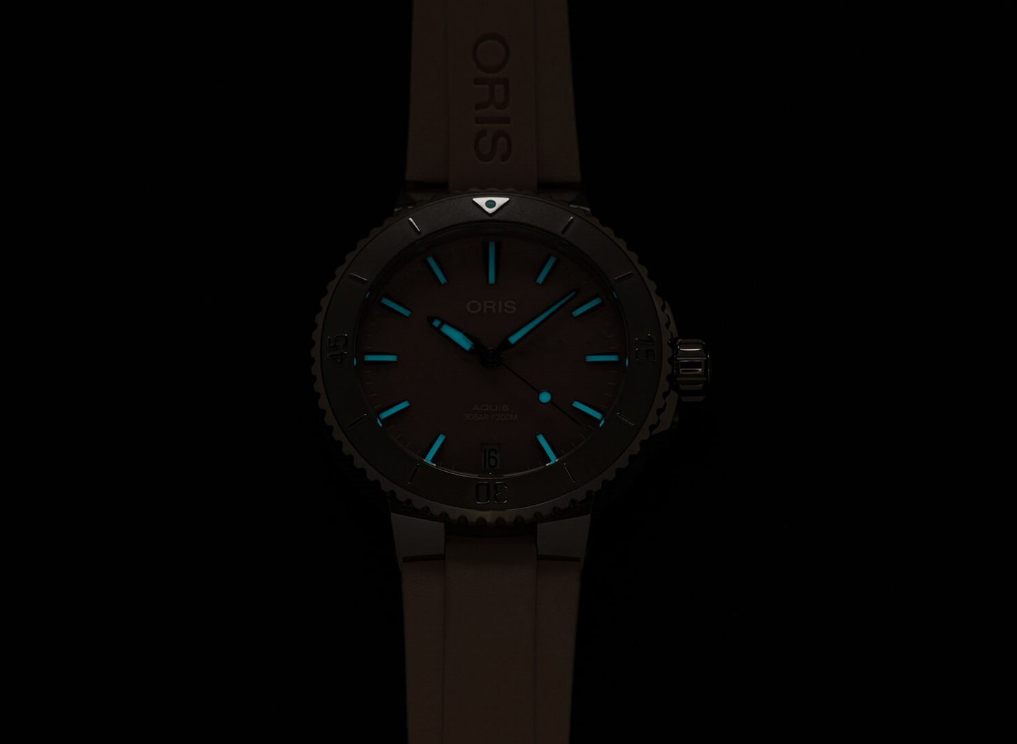 Oris Aquis Date 01 733 7770 4158-07 4 18 66FC jsou dámské automatické hodinky na růžovém kaučukovém řemínku s překlápěcí sponou. Pouzdro z nerezové oceli má průměr 36,5 milimetru, průhledné dýnko a jednosměrně otočnou lunetu s potápěčskou stupnicí. Růžový perleťový číselník s indikací data na šesté hodině je chráněn odolným safírovým sklem s antireflexní vrstvou a jeho krása vyniká zejména pod přímým světlem, kdy můžeme pozorovat hru barev perleti podobající se vodní hladině. Ručičky, indexy a část lunety jsou pokryty luminiscenčním nátěrem Super-LumiNova®, který garantuje perfektní čitelnost za zhoršených světelných podmínek. Pohon hodinek zajišťuje mechanický strojek Oris 733 s automatickým nátahem a rezervou chodu přibližně 38 hodin. Základem tohoto kalibru je Sellita SW200-1. Tento strojek s funkcí hackingu lze v případě potřeby natahovat i ručně pomocí signované šroubovací korunky. Vodotěsnost hodinek činí 30 ATM a jsou tak vhodnou volbou pro šnorchlování a potápění.