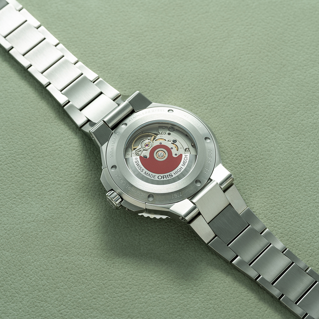 Oris Aquis Date Taste of Summer 01 733 7787 4137-07 8 22 04PEB jsou pánské automatické hodinky na ocelovém náramku v kombinaci brusu a lesku s překlápěcí sponou. Pouzdro z nerezové oceli má průměr 41,5 milimetru, průhledné dýnko a jednosměrně otočnou lunetu s bílou keramickou vložkou s potápěčskou stupnicí. Světle zelený číselník s efektem slunečního brusu a indikací data na šesté hodině je chráněn odolným safírovým sklem s antireflexní vrstvou. Ručičky, indexy a část lunety jsou pokryty luminiscenčním nátěrem Super-LumiNova®, který garantuje perfektní čitelnost za zhoršených světelných podmínek. Pohon hodinek zajišťuje mechanický strojek Oris 733 s automatickým nátahem a rezervou chodu přibližně 38 hodin. Základem tohoto kalibru je Sellita SW200-1. Tento strojek s funkcí hackingu lze v případě potřeby natahovat i ručně pomocí signované šroubovací korunky. Vodotěsnost hodinek činí 30 ATM a jsou tak vhodnou volbou pro šnorchlování a potápění.