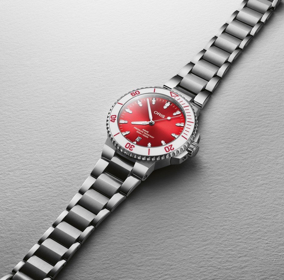 Oris Aquis Date Taste of Summer 01 733 7787 4138-07 8 22 04PEB jsou pánské automatické hodinky na ocelovém náramku v kombinaci brusu a lesku s překlápěcí sponou. Pouzdro z nerezové oceli má průměr 41,5 milimetru, průhledné dýnko a jednosměrně otočnou lunetu s bílou keramickou vložkou s potápěčskou stupnicí. Červený číselník s efektem slunečního brusu a indikací data na šesté hodině je chráněn odolným safírovým sklem s antireflexní vrstvou. Ručičky, indexy a část lunety jsou pokryty luminiscenčním nátěrem Super-LumiNova®, který garantuje perfektní čitelnost za zhoršených světelných podmínek. Pohon hodinek zajišťuje mechanický strojek Oris 733 s automatickým nátahem a rezervou chodu přibližně 38 hodin. Základem tohoto kalibru je Sellita SW200-1. Tento strojek s funkcí hackingu lze v případě potřeby natahovat i ručně pomocí signované šroubovací korunky. Vodotěsnost hodinek činí 30 ATM a jsou tak vhodnou volbou pro šnorchlování a potápění.