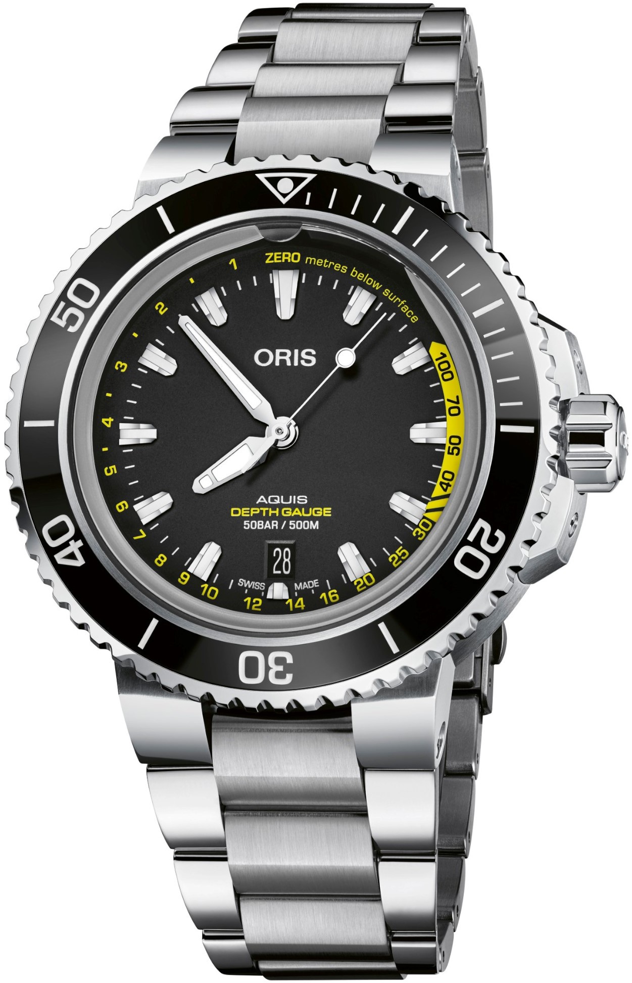 Oris Aquis Depth Gauge 01 733 7755 4154-Set MB sú pánske automatické hodinky na oceľovom náramku v kombinácii brúsu a lesku s preklápacou sponou. Puzdro z nerezovej ocele má priemer 45,8 milimetra a jednosmerne otočnú lunetu s keramickou vložkou s potápačskou stupnicou. Čierny číselník s dátumovkou a indikáciou hĺbky pod vodnou hladinou je chránený odolným zafírovým sklom s antireflexnou vrstvou. Ručičky, indexy a časť lunety sú pokryté luminiscenčným náterom Super-LumiNova®, ktorý garantuje perfektnú čitateľnosť za zhoršených svetelných podmienok. Pohon hodiniek zaisťuje mechanický strojček Oris 733 s automatickým náťahom a rezervou chodu približne 38 hodín. Základom tohto kalibru je Sellita SW200-1. Tento strojček s funkciou hackingu je možné v prípade potreby naťahovať aj ručne pomocou signovanej skrutkovacej korunky. Vodotesnosť hodiniek robí 50 ATM a sú tak vhodnou voľbou pre prístrojové potápanie.