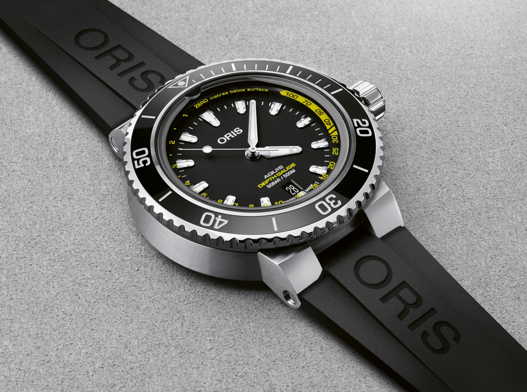 Oris Aquis Depth Gauge 01 733 7755 4154-Set RS sú pánske automatické hodinky na čiernom kaučukovom remienku s preklápacou sponou. Puzdro z nerezovej ocele má priemer 45,8 milimetra a jednosmerne otočnú lunetu s keramickou vložkou s potápačskou stupnicou. Čierny číselník s dátumovkou a indikáciou hĺbky pod vodnou hladinou je chránený odolným safírovým sklom s antireflexnou vrstvou. Ručičky, indexy a časť lunety sú pokryté luminiscenčným náterom Super-LumiNova®, ktorý garantuje perfektnú čitateľnosť za zhoršených svetelných podmienok. Pohon hodiniek zaisťuje mechanický strojček Oris 733 s automatickým náťahom a rezervou chodu približne 38 hodín. Základom tohto kalibru je Sellita SW200-1. Tento strojček s funkciou hackingu je možné v prípade potreby naťahovať aj ručne pomocou signovanej skrutkovacej korunky. Vodotesnosť hodiniek robí 50 ATM a sú tak vhodnou voľbou pre prístrojové potápanie.