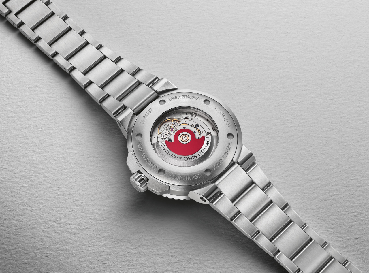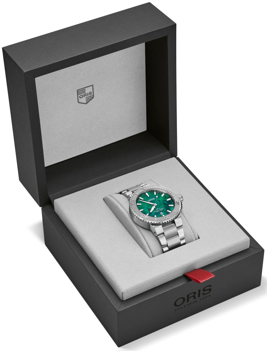 Oris Aquis x Bracenet 01 733 7730 4137-07 8 24 05PEB jsou pánské automatické hodinky na ocelovém náramku v kombinaci brusu a lesku s překlápěcí sponou. Pouzdro z nerezové oceli má průměr 43,5 milimetru, průhledné dýnko a jednosměrně otočnou lunetu s potápěčskou stupnicí. Zelený číselník s datumovkou a unikátní texturou byl vyroben z recyklovaných rybářských sítí ve spolupráci s německou společností Bracenet. Chrání ho odolné safírové sklo s antireflexní vrstvou. Ručičky, indexy a část lunety jsou pokryty luminiscenčním nátěrem Super-LumiNova®, který garantuje perfektní čitelnost za zhoršených světelných podmínek. Pohon hodinek zajišťuje mechanický strojek Oris 733 s automatickým nátahem a rezervou chodu přibližně 38 hodin. Základem tohoto kalibru je Sellita SW200-1. Tento strojek s funkcí hackingu lze v případě potřeby natahovat i ručně pomocí signované šroubovací korunky. Vodotěsnost hodinek činí 30 ATM a jsou tak vhodnou volbou pro šnorchlování a potápění.