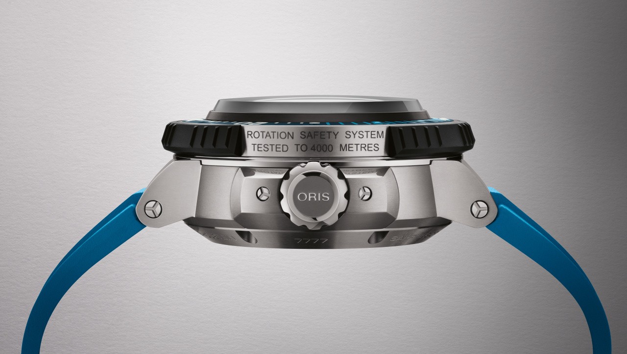 Oris AquisPro 4000m 01 400 7777 7155-Set jsou pánské automatické hodinky na modrém kaučukovém řemínku s překlápěcí sponou. Pouzdro z titanu má průměr 49,5 milimetru a jednosměrně otočnou lunetu s keramickou vložkou s potápěčskou stupnicí a Orisem patentovaným rotačním bezpečnostním systémem (Rotation Safety System - RSS) navrženým pro potápěče k uzamčení lunety, aby se zabránilo jejím náhodným úpravám během ponoru. Modrý číselník se vzorem vln a indikací data na šesté hodině je chráněn odolným safírovým sklem s antireflexní vrstvou. Ručičky, indexy a lunetu pokrývá luminiscenční nátěr Super-LumiNova®, který garantuje perfektní čitelnost za zhoršených světelných podmínek. Pohon hodinek zajišťuje mechanický manufakturní strojek Oris 400 s automatickým nátahem a nadstandardní rezervou chodu ve výši 5 dní. Strojek disponuje dvěma pérovníky a chybí mu tradiční červený rotor, čímž se kalibr 400 odlišuje od modelů značky s běžnými strojky. Kromě pětidenní rezervy chodu nabízí strojek ještě zvýšenou odolnost vůči magnetismu, čemuž napomáhají mimo jiné kotva a krokové kolo z křemíku. Oris u tohoto strojku doporučuje servisní interval 10 let, tedy dvojnásobek doporučené doby u běžných mechanických hodinek, a především strojku věří natolik, že u něj poskytuje záruku taktéž ve výši 10 let! Tento strojek s funkcí hackingu, který lze v případě potřeby natahovat i ručně pomocí signované šroubovací korunky. Vodotěsnost hodinek činí 400 ATM a jsou tak vhodnou volbou pro profesionální hlubinné potápění.