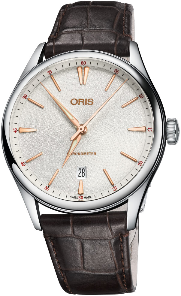Oris Artelier Date 01 737 7721 4031-07 5 21 65FC sú pánske elegantné hodinky na hnedom koženom remienku s preklápacou sponou. Oceľové puzdro má priemer 40 milimetrov a priehľadné viečko, ktoré ponúka pohľad do stroja a na červený rotor, ktorý sa stal poznávacím znamením pre značku Oris. Strieborný štruktúrovaný číselník s ukazovateľom dátumu na šiestej hodine je chránený zafírovým sklom s vnútornou antireflexnou vrstvou pre minimalizovanie odleskov svetla. Ručičky sú ošetrené náterom Super-LumiNova®, ktorý garantuje perfektnú čitateľnosť za zhoršených svetelných podmienok. Chod hodiniek zaisťuje mechanický strojček Oris 737 s automatickým náťahom a rezervou chodu 38 hodín. Tento strojček s funkciou hackingu možno v prípade potreby naťahovať aj ručne pomocou korunky. Hodinky s C.O.S.C. certifikáciou, ktorá je zárukou vysokej presnosti, nesú označenie „Chronometer“. S vodotesnosťou 5 ATM sú odolné proti dažďu a pri sprchovaní.