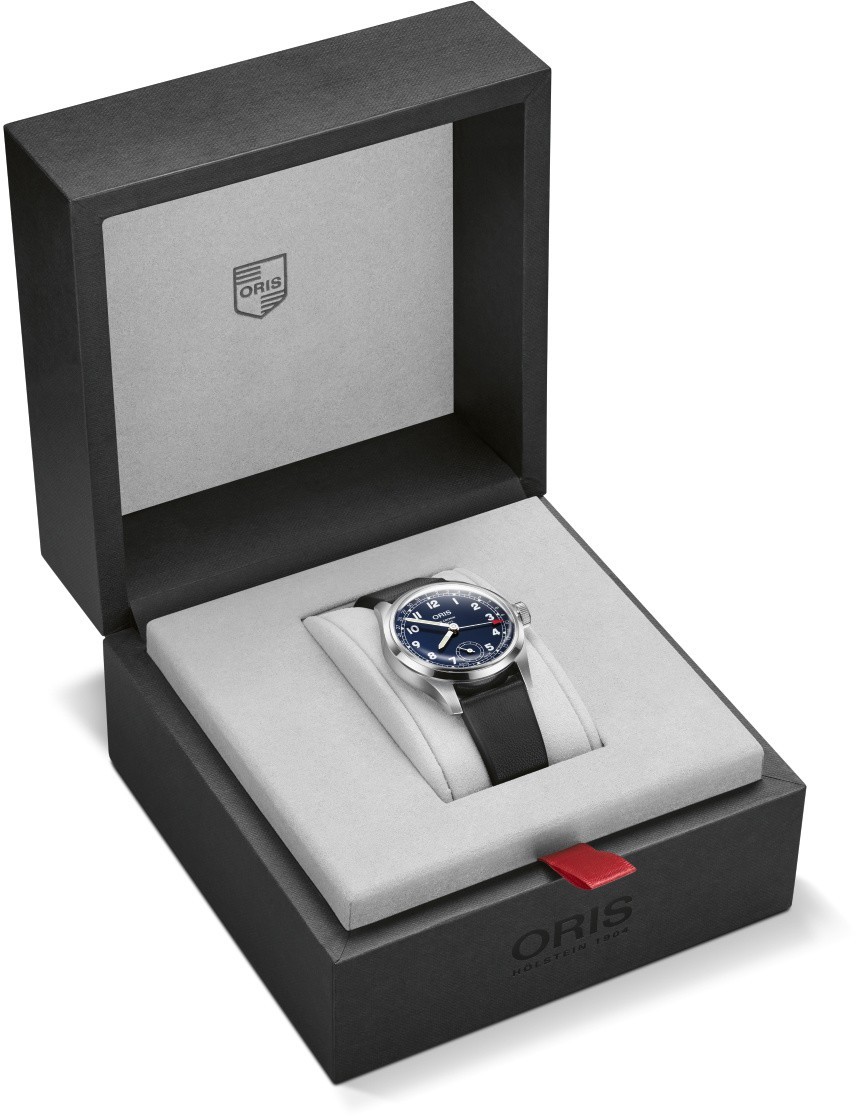 Oris Big Crown Pointer Date 01 403 7776 4065-07 5 19 11 sú pánske elegantné hodinky na čiernom koženom remienku s tŕňovou sponou. Oceľové puzdro má priemer 40 milimetrov, skrutkovaciu korunku a priehľadné viečko, ktoré ponúka pohľad na stroj hodiniek. Tmavomodrý číselník s priebežnou sekundovou ručičkou na šiestej hodine je chránený klenutým zafírovým sklom s vnútornou antireflexnou vrstvou na minimalizovanie odleskov svetla.