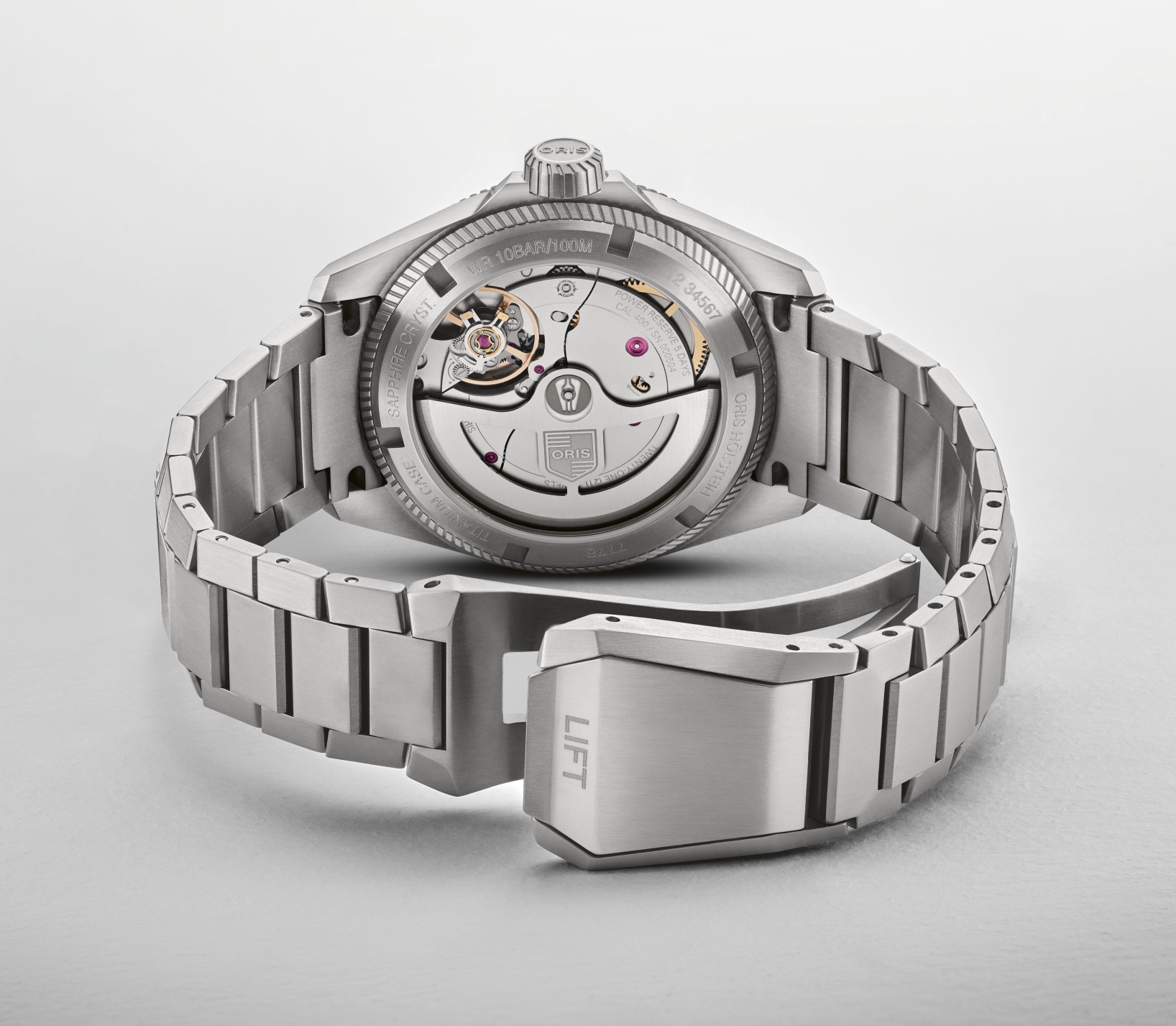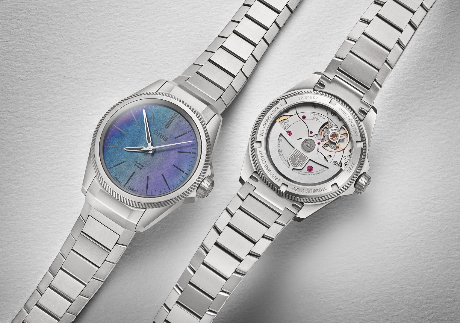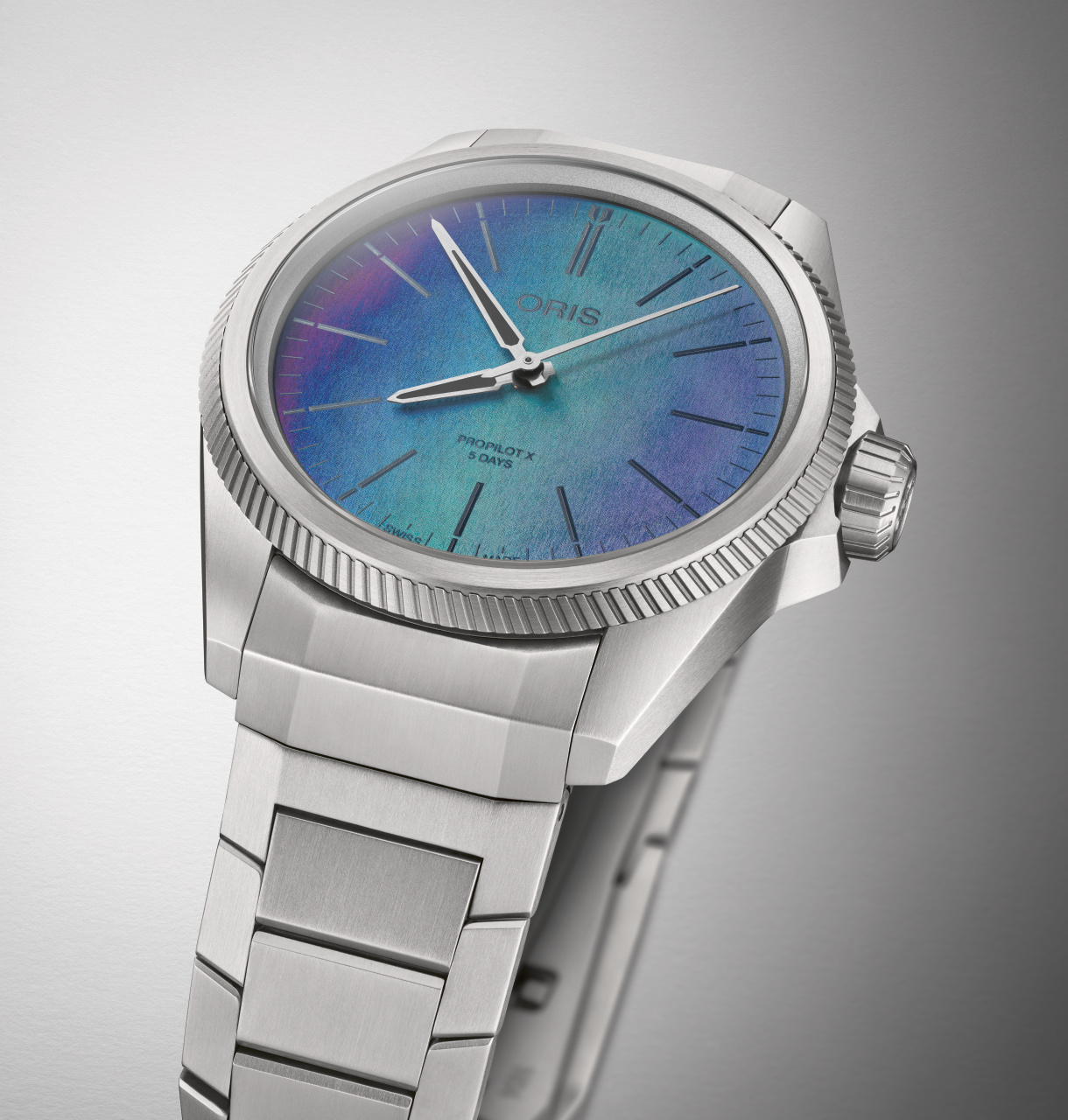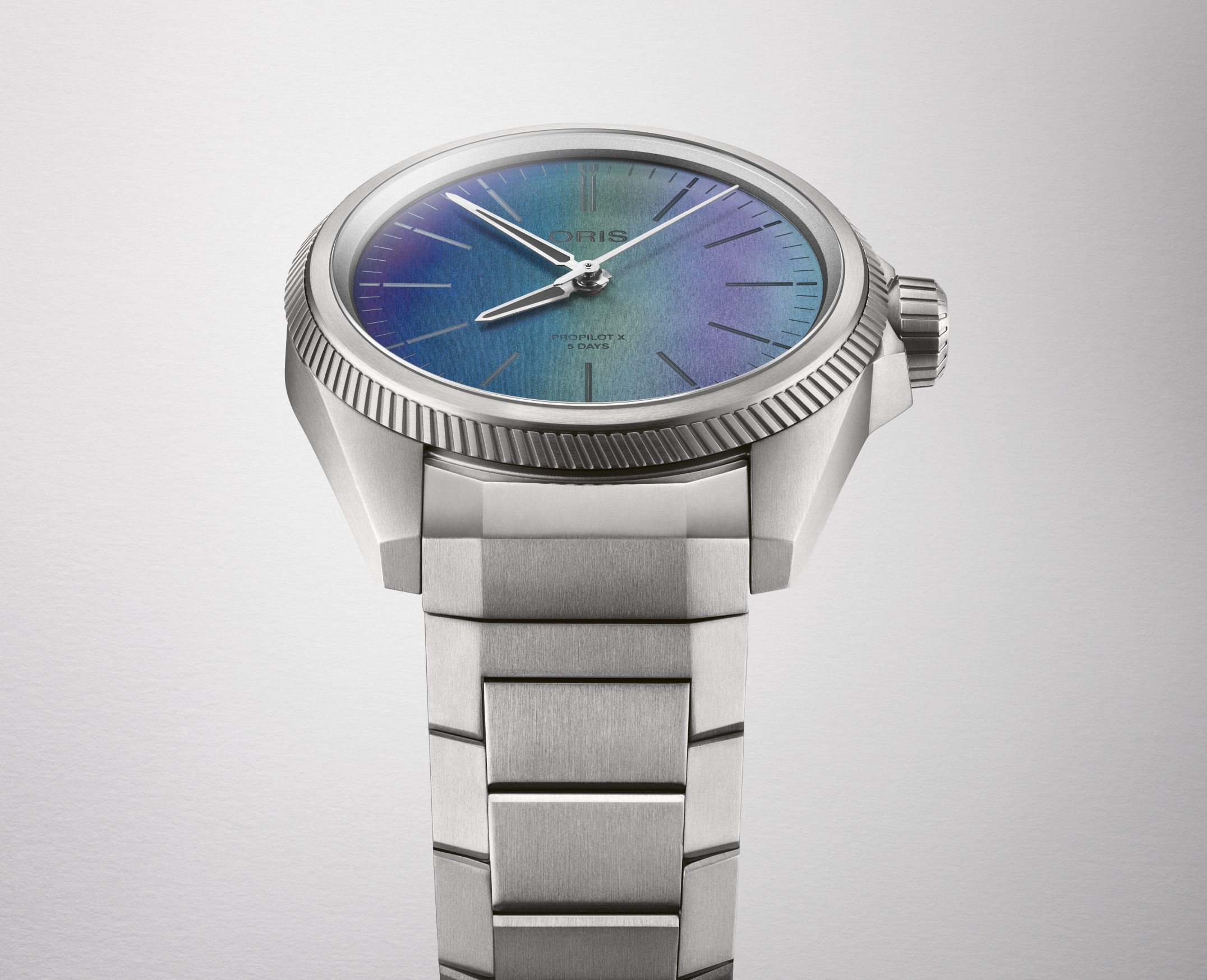 Ostré linie pouzdra inspirovaného letectvím jsou upraveny saténovou a pískovanou povrchovou úpravou, což hodinkám dodává syrový, technický vzhled doplněný známou zubatou lunetou ProPilot.Titanové pouzdro o průměru 39 milimetrů je zasazeno do masivně tvarovaného titanového náramku opatřeného překlápěcí sponou s patentovaným systémem „LIFT“ od společnosti Oris. Barevný číselník hodinek využívá nejmodernější laserovou technologii inspirovanou biomimikou a odráží zázraky přírody jako jsou duhová křídla brouka. Modrého, zeleného a fialového odstínu je dosaženo díky odrážejícímu se světlu, nikoli pigmentem.
