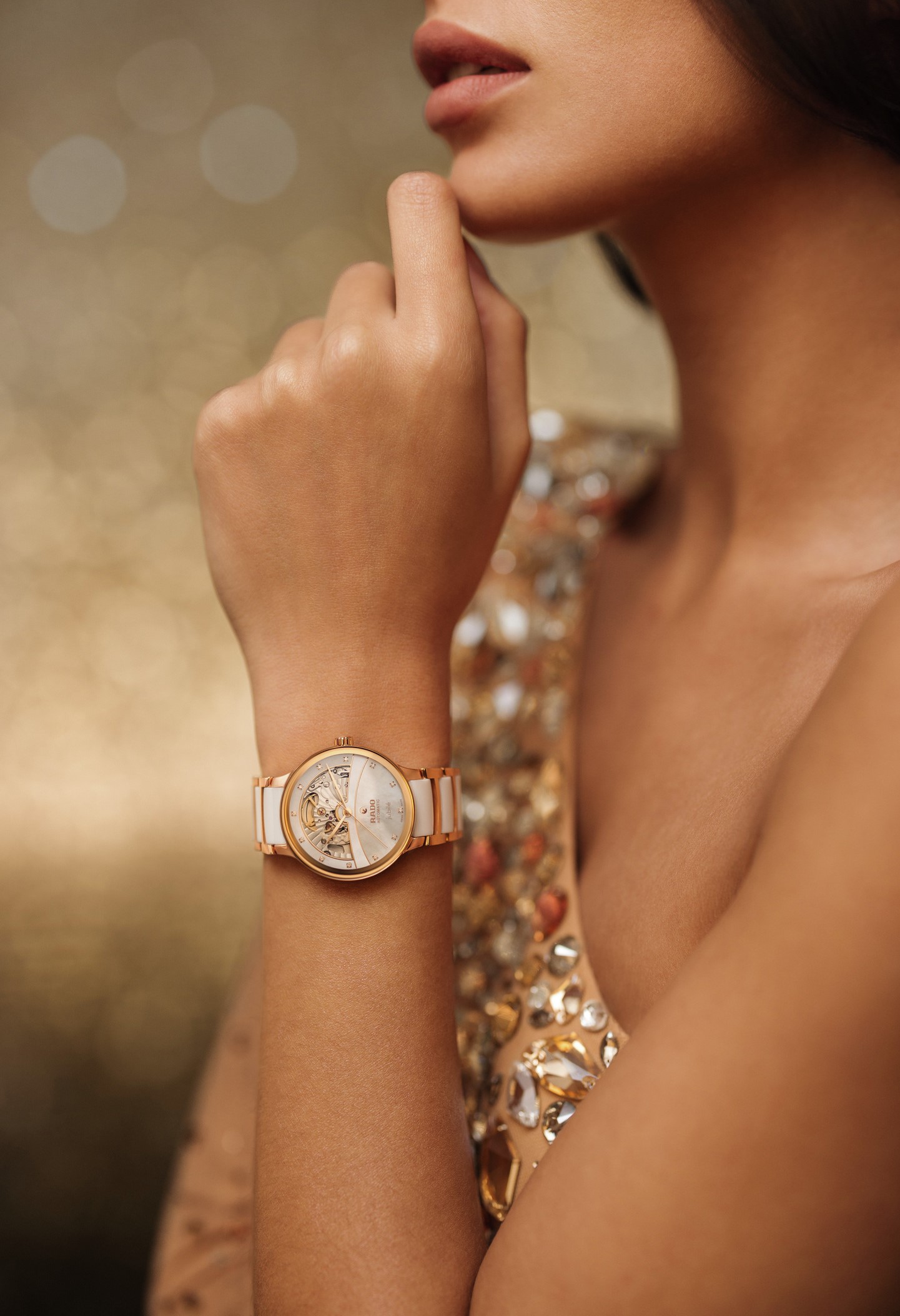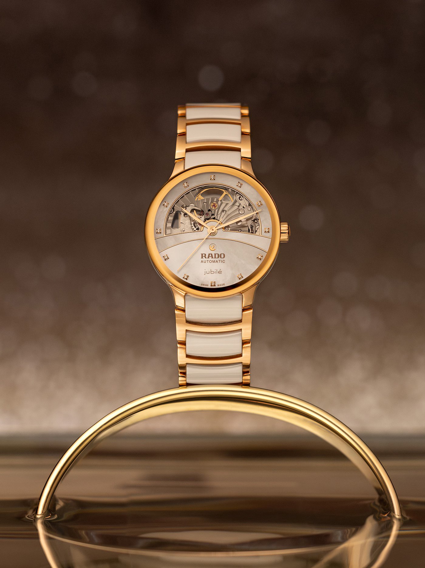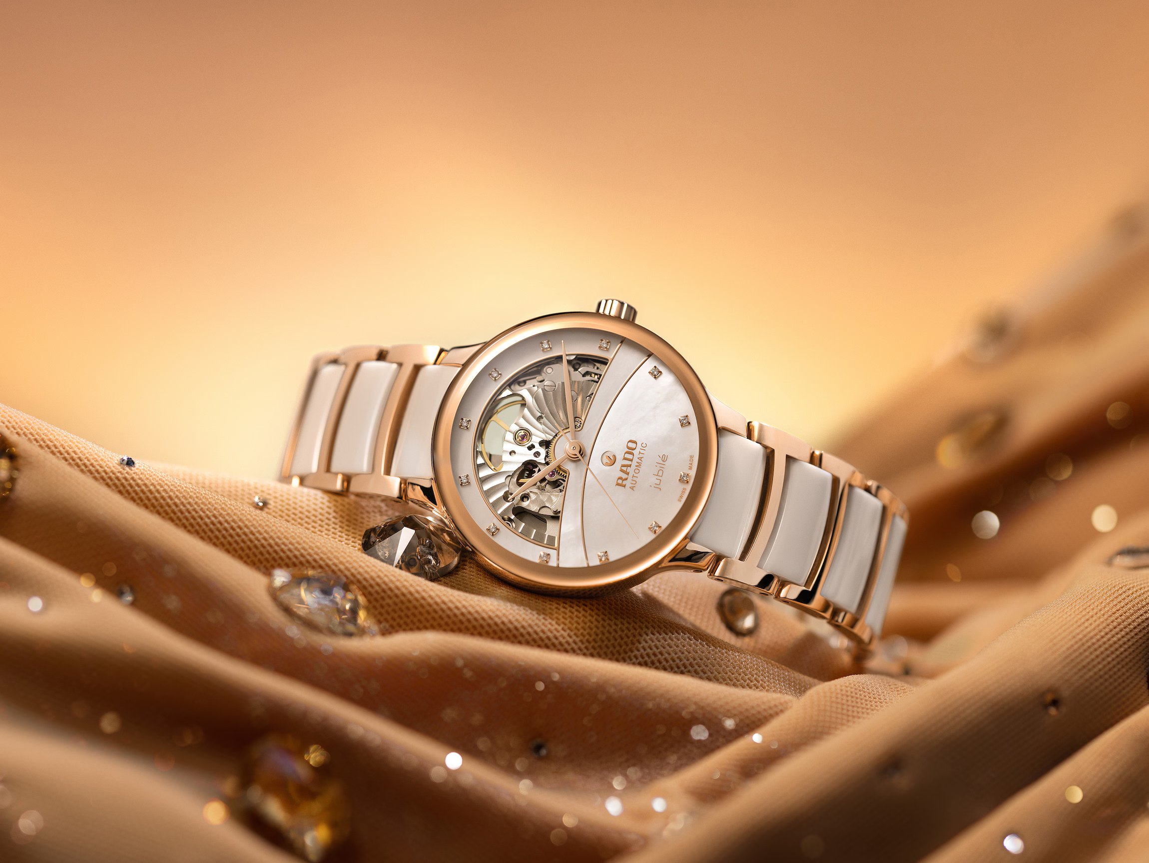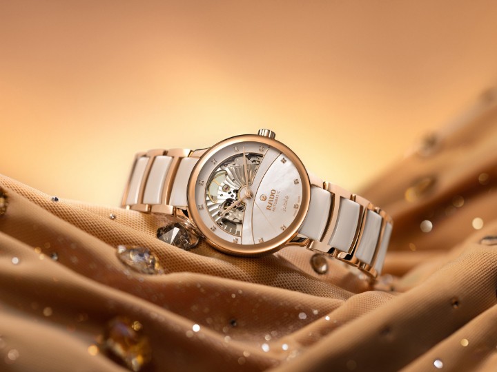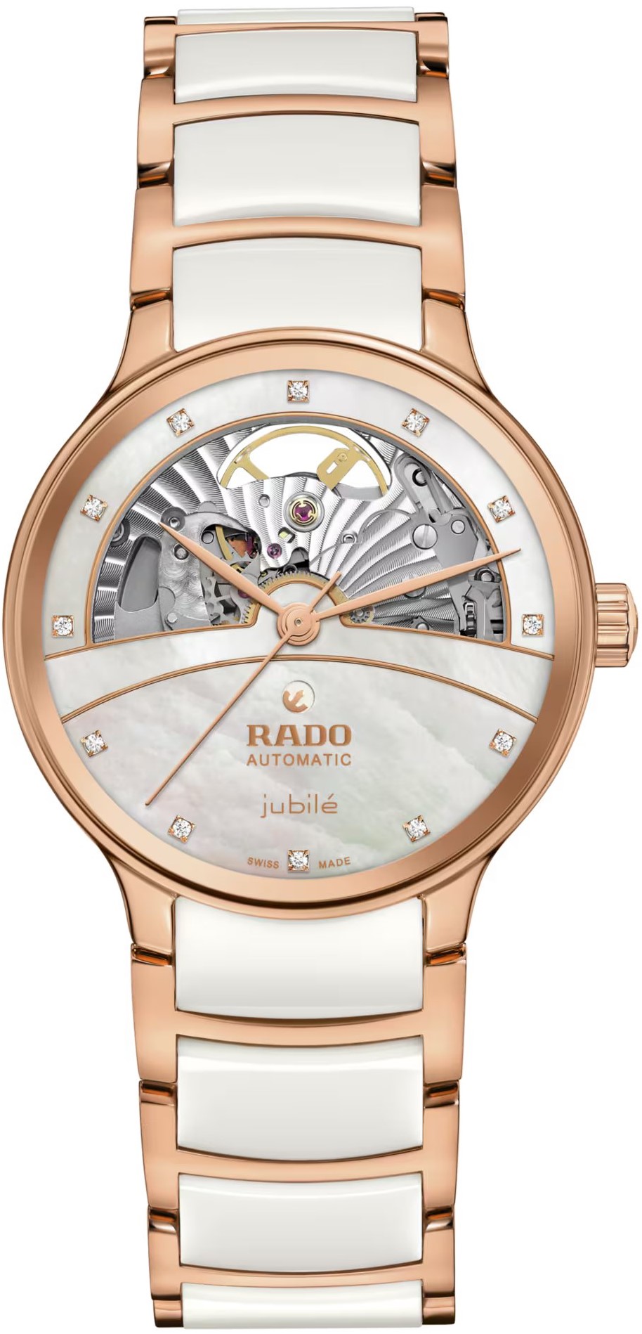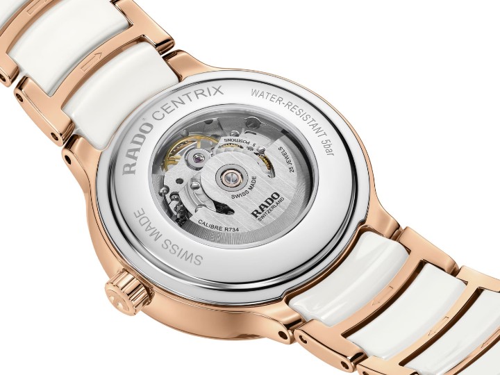 Rado Centrix Automatic Diamond Open Heart R30029922 sú dámske automatické hodinky elegantného štýlu s lešteným oceľovým puzdrom s priemerom 35 milimetrov. Náramok tvorí kombinácia keramického materiálu High-Tech Ceramic a ocele s motýlikovou sponou. Puzdro s korunkou a oceľové časti náramku sú opatrené PVD úpravou vo farbe ružového zlata. Perleťový čiastočne skeletónový číselník zdobí 12 diamantov a jeho krása vyniká najmä pod priamym svetlom, kedy môžeme pozorovať hru farieb perlete. Je chránený tzv. „edge to edge“ zafírovým sklom s antireflexnou vrstvou a metalizovaným rámčekom, ktoré siaha až k úplnému okraju puzdra a spolu so zafírovým priehľadným viečkom ponúka pohľad na mechanický strojček s automatickým náťahom (03.734.532), ktorý je dekorovaný perlážou a ženevskými pruhmi. Tento strojček s rezervou chodu 80 hodín disponuje funkciou hackingu (zastavenie sekundovej ručičky pri vytiahnutí korunky do krajnej polohy) a je možné ho v prípade potreby naťahovať aj ručne. Vďaka použitiu antimagnetického vlásku zotrvačky Nivachron™ z titánovej zliatiny je kaliber vysoko odolný voči vplyvom magnetického poľa. Pre dosiahnutie čo najvyššej možnej presnosti je stroj testovaný v piatich pozíciách. Hodinky disponujú vodotesnosťou 5 ATM a sú teda odolné proti dažďu a pri sprchovaní.