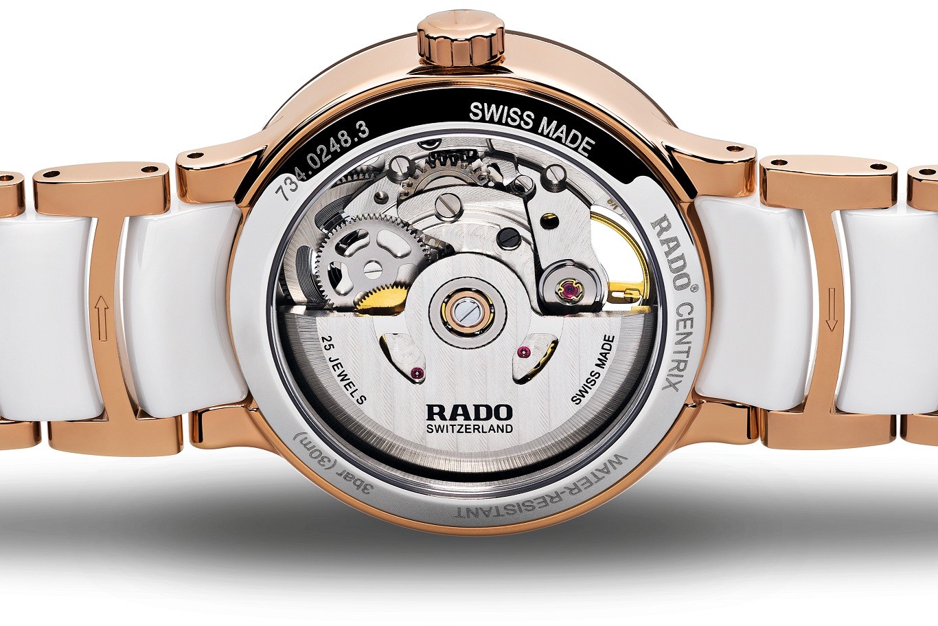 Rado Centrix R30248902 sú dámske automatické hodinky elegantného štýlu s lešteným oceľovým puzdrom s priemerom 33 milimetrov. Náramok tvorí kombinácia keramického materiálu High-Tech Ceramic a ocele s titánovou preklápacou sponou. Puzdro s korunkou a oceľové časti náramku sú opatrené PVD úpravou vo farbe ružového zlata. Perleťový čiastočne skeletónový číselník zdobí 12 diamantov s hmotnosťou 0,037 ct a jeho krása vyniká najmä pod priamym svetlom, kedy môžeme pozorovať hru farieb perlete. Je chránený tzv. „edge to edge“ zafírovým sklom s metalizovaným rámčekom, ktoré siaha až k úplnému okraju puzdra a spolu so zafírovým priehľadným viečkom ponúka pohľad na mechanický strojček s automatickým náťahom R734 (03.734.332), ktorý je dekorovaný perlážou a ženevskými pruhmi. Tento strojček s rezervou chodu 80 hodín disponuje funkciou hackingu (zastavenie sekundovej ručičky pri vytiahnutí korunky do krajnej polohy) a je možné ho v prípade potreby naťahovať aj ručne. Vďaka použitiu antimagnetického vlásku zotrvačky Nivachron™ z titánovej zliatiny je kaliber vysoko odolný voči vplyvom magnetického poľa. Na dosiahnutie čo najvyššej možnej presnosti je stroj testovaný v piatich pozíciách. Hodinky disponujú vodotesnosťou 3 ATM a sú teda odolné proti vlhkosti, dažďu a pri umývaní rúk.