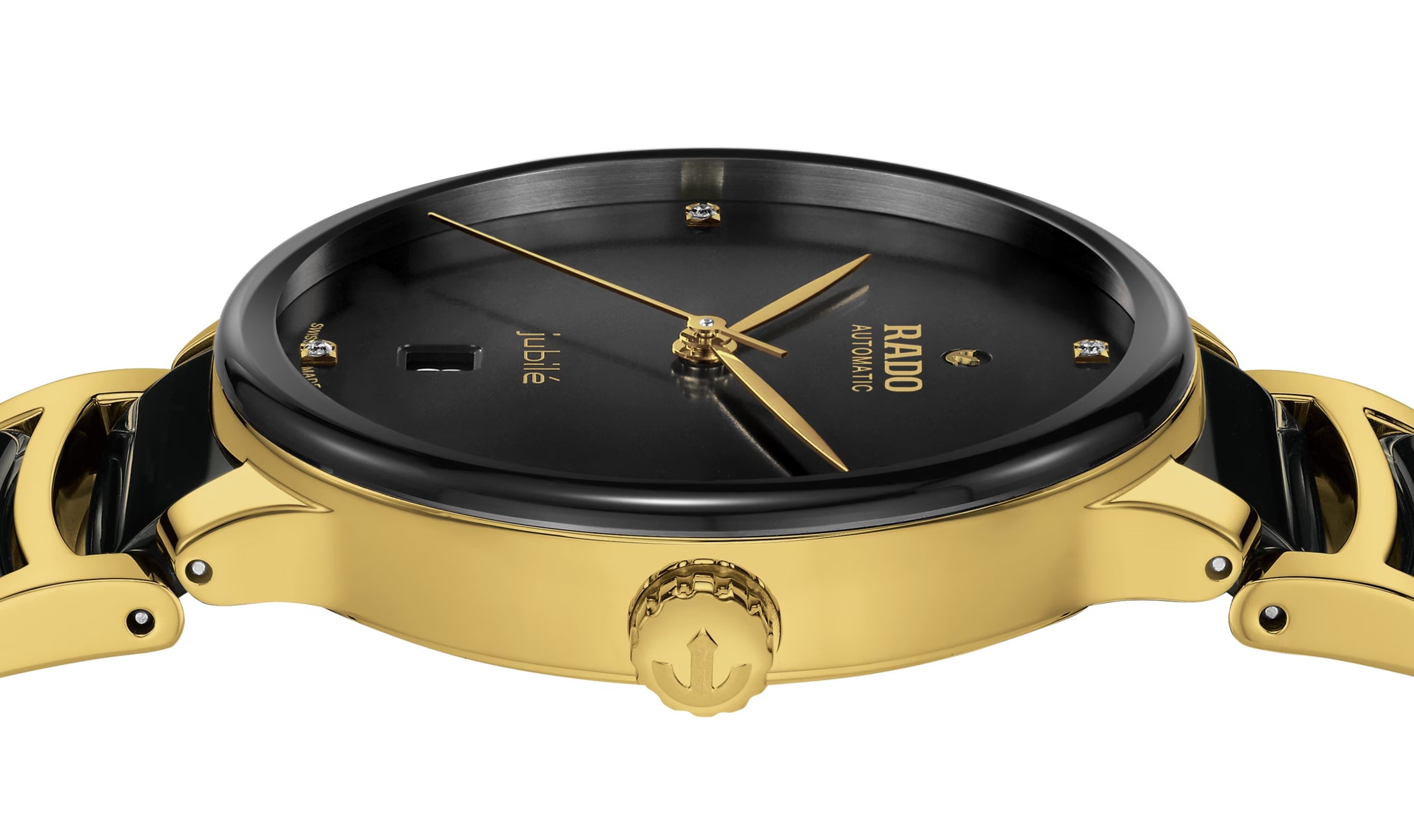 Rado Centrix Automatic Diamonds R30008712 sú automatické unisex hodinky elegantného štýlu s oceľovým puzdrom s priemerom 39,5 milimetra. Náramok tvorí kombinácia materiálu High-Tech Ceramic a ocele. Puzdro s korunkou a oceľové časti náramku sú ošetrené PVD úpravou vo farbe zlata. Čierny číselník s dátumovkou zdobený 4 diamantmi je chránený tzv. „edge to edge“ zafírovým sklom s metalizovaným rámčekom, ktoré siaha až k úplnému okraju puzdra.  Priehľadné viečko umožňuje pohľad na automatický kaliber R763 (03.763.242) dekorovaný ženevskými pruhmi a perlážou. Tento mechanický strojček s automatickým náťahom a rezervou chodu 80 hodín disponuje funkciou hackingu (zastavenie sekundovej ručičky pri vytiahnutí korunky do krajnej polohy) a je možné ho v prípade potreby naťahovať aj ručne. Vďaka použitiu antimagnetického vlásku zotrvačky Nivachron™ z titánovej zliatiny je tento kaliber vysoko odolný voči vplyvom magnetického poľa. Pre dosiahnutie čo najvyššej možnej presnosti je stroj testovaný v piatich pozíciách. Hodinky disponujú vodotesnosťou 5 ATM a sú teda odolné proti dažďu a pri sprchovaní.