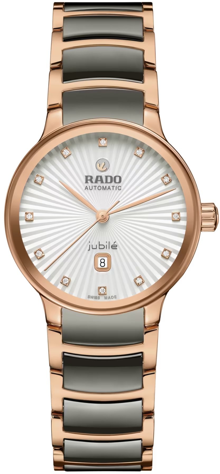 Rado Centrix Automatic Diamonds R30019742 jsou dámské automatické hodinky elegantního stylu s ocelovým pouzdrem o průměru 30,5 milimetru. Náramek tvoří kombinace materiálu Plasma High-Tech Ceramic a oceli. Pouzdro s korunkou a ocelové části náramku jsou ošetřeny PVD úpravou v barvě růžového zlata. Bílý fazetovaný číselník s datumovkou na šesté hodině zdobený 12 diamanty Top Wesselton o hmotnosti 0,038 ct a čistotě VS-SI je chráněn tzv. „edge to edge“ safírovým sklem s metalizovaným rámečkem, které sahá až k úplnému okraji pouzdra. Průhledné dýnko umožňuje pohled na automatický kalibr R582 (03.582.431) dekorovaný ženevskými pruhy a perláží. Tento mechanický strojek s automatickým nátahem a rezervou chodu 48 hodin disponuje funkcí hackingu (zastavení vteřinové ručky při vytažení korunky do krajní polohy) a je možné ho v případě potřeby natahovat i ručně. Díky použití antimagnetického vlásku setrvačky Nivachron™ z titanové slitiny je tento kalibr vysoce odolný vůči vlivům magnetického pole. Pro dosažení co nejvyšší možné přesnosti je stroj testován v pěti pozicích. Hodinky disponují vodotěsností 5 ATM a jsou tedy odolné proti dešti a při sprchování.