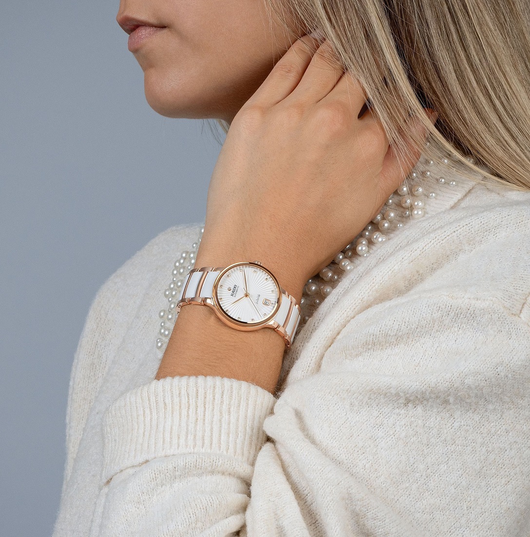 Rado Centrix Automatic Diamonds R30037744 sú dámske automatické hodinky elegantného štýlu s oceľovým puzdrom s priemerom 35 milimetrov. Náramok tvorí kombinácia materiálu High-Tech Ceramic a ocele. Puzdro s korunkou a oceľové časti náramku sú ošetrené PVD úpravou vo farbe ružového zlata. Biely fazetovaný číselník s dátumovkou na šiestej hodine zdobený 12 diamantmi Top Wesselton o hmotnosti 0,051 ct a čistote VS-SI je chránený tzv. „edge to edge“ zafírovým sklom s metalizovaným rámčekom, ktoré siaha až k úplnému okraju púzdra.  Priehľadné viečko umožňuje pohľad na automatický kaliber R763 (03.763.241) dekorovaný ženevskými pruhmi a perlážou. Tento mechanický strojček s automatickým náťahom a rezervou chodu 80 hodín disponuje funkciou hackingu (zastavenie sekundovej ručičky pri vytiahnutí korunky do krajnej polohy) a je možné ho v prípade potreby naťahovať aj ručne. Vďaka použitiu antimagnetického vlásku zotrvačky Nivachron™ z titánovej zliatiny je tento kaliber vysoko odolný voči vplyvom magnetického poľa. Pre dosiahnutie čo najvyššej možnej presnosti je stroj testovaný v piatich pozíciách. Hodinky disponujú vodotesnosťou 5 ATM a sú teda odolné proti dažďu a pri sprchovaní.