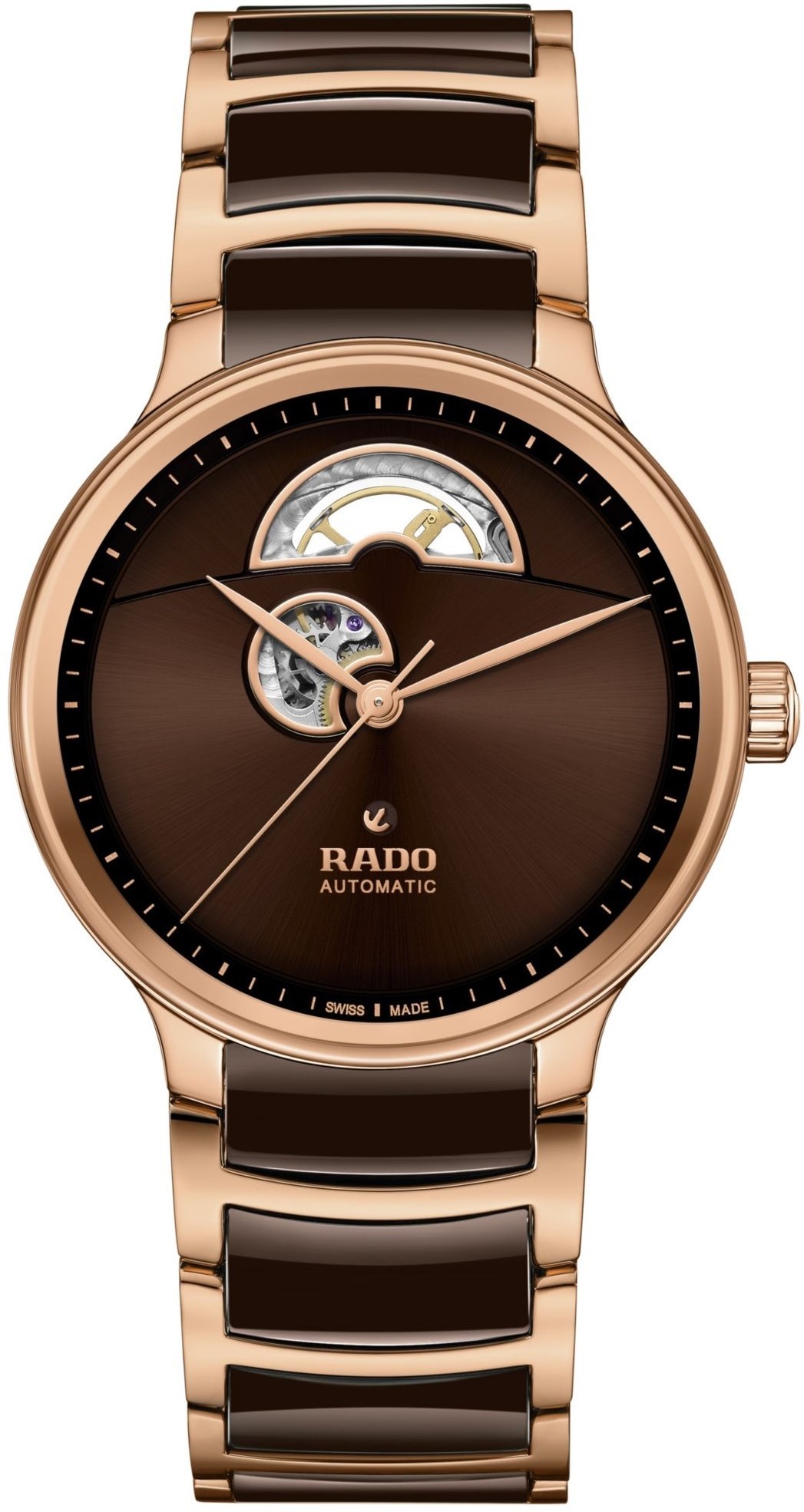 Rado Centrix Automatic Open Heart R30013302 sú automatické unisex hodinky elegantného štýlu s nerezovým puzdrom s priemerom 39,5 milimetra. Náramok tvorí kombinácia keramického materiálu High-Tech Ceramic a ocele. Puzdro s korunkou a oceľové časti náramku sú ošetrené PVD úpravou vo farbe ružového zlata. Hnedý číselník s efektom slnečného brusu ponúka vďaka komplikácii open heart pohľad do samotného srdca mechanického stroja. Číselník chráni tzv. „edge to edge“ zafírové sklíčko s obojstrannou antireflexnou vrstvou a metalizovaným okrajom, ktoré siaha až k úplnému okraju puzdra. Priehľadné viečko umožňuje pohľad na automatický kaliber R764 (03.734.431), ktorý je dekorovaný perlážou a ženevskými pruhmi. Tento mechanický strojček s automatickým náťahom a rezervou chodu 80 hodín disponuje funkciou hackingu (zastavenie sekundovej ručičky pri vytiahnutí korunky do krajnej polohy) a je možné ho v prípade potreby naťahovať aj ručne. Vďaka použitiu antimagnetického vlásku zotrvačky Nivachron™ z titánovej zliatiny je tento kaliber vysoko odolný voči vplyvom magnetického poľa. Pre dosiahnutie čo najvyššej možnej presnosti je stroj testovaný v piatich pozíciách. Hodinky disponujú vodotesnosťou 5 ATM a sú teda odolné proti dažďu a pri sprchovaní.